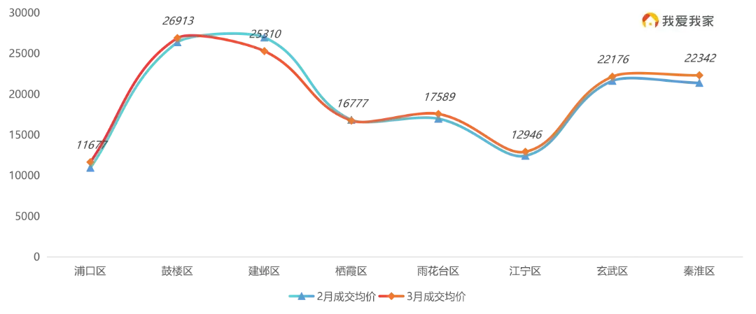 从各区均价来看,鼓楼房价仍居首位,3月成交均价26913元/㎡,环比小幅上涨2%;建邺排在第二位,成交均价2.53万/㎡左右;秦淮、玄武均价也在2.2万+/㎡。