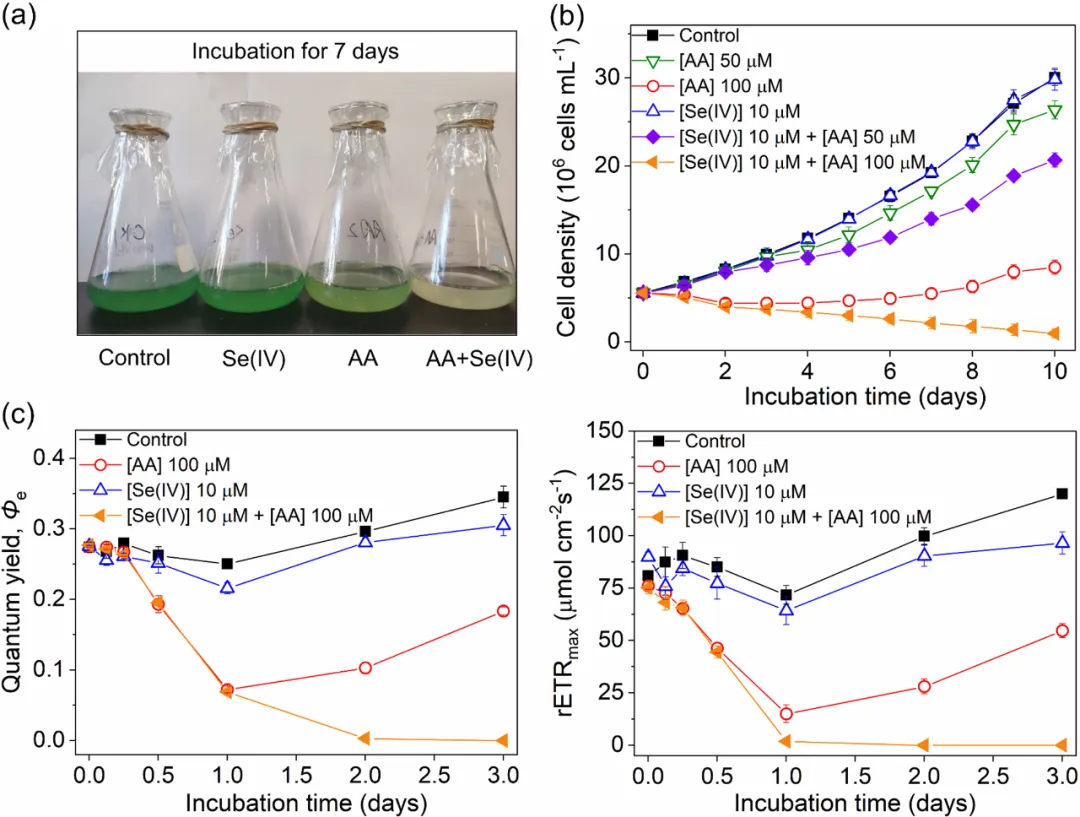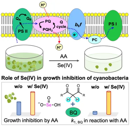 Sci. Technol. 2022, 56, 9683−9692)。在含藻水体中,Se(IV)普遍存在且能被藻细胞高效富集。因此,有必要探究Se(IV)对AA抑藻作用的影响和机制。