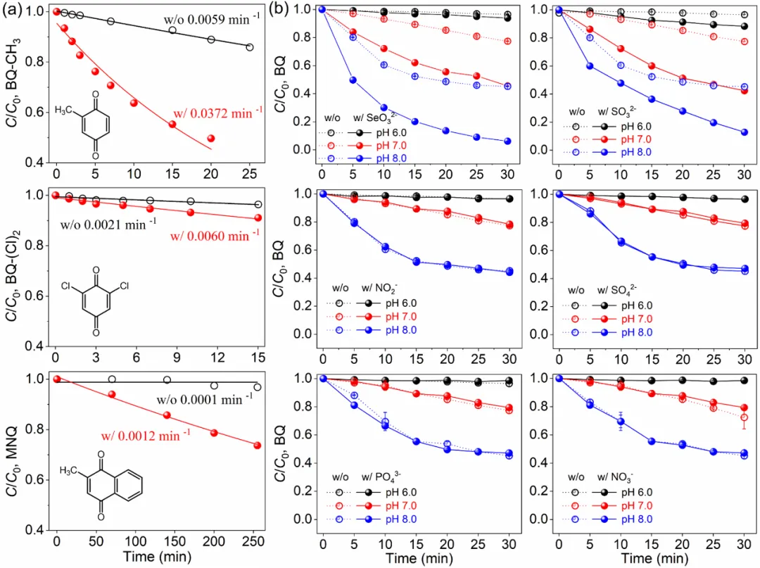 rate (rETRmax). [AA] = 100 μM or 50 μM, [Se(IV)] = 10 μM.如Fig. 1a和1b所示,投加低浓度的Se(IV)显著促进了AA抑制铜绿微囊藻的效果。基于对Φe和rETRmax的时序差异分析(Fig. 1c),论文判断上述抑藻效果的增强源于Se(IV)促进了AA对蓝藻光合系统的破坏。为判断Se(IV)的协同强化效应是否与AA和醌的反应有关,论文选取了4种代表性的醌,观察到AA与4种醌的反应均能被Se(IV)促进,且促进效果在中性至弱碱性条件下更为显著(Fig. 2)。除具有较强还原能力的亚硫酸盐外,水体中几种常见的含氧酸盐,包括硫酸盐、磷酸盐、硝酸盐和亚硝酸盐,均不促进AA与BQ的反应。