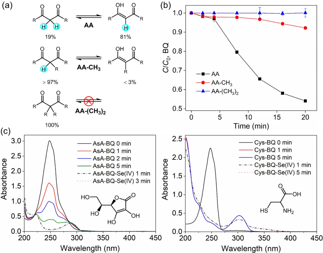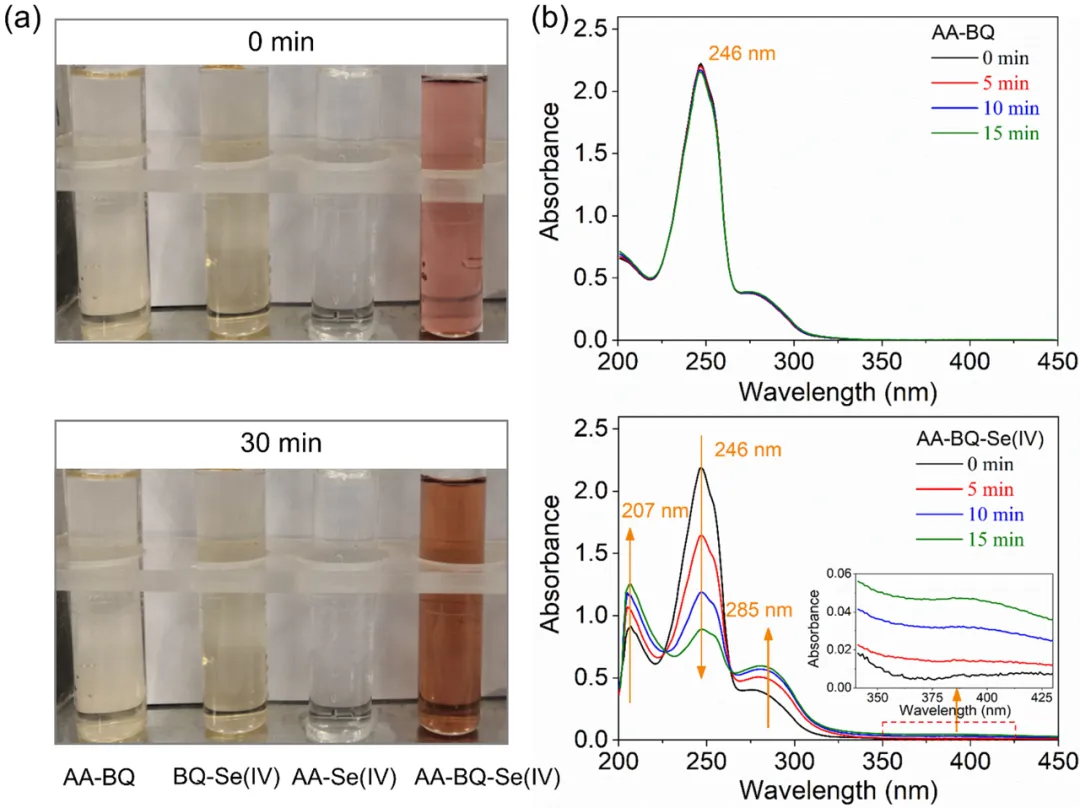 = [AA] = 200 μM.论文进一步利用UV-vis吸收光谱探讨了Se(IV)在AA-BQ反应中的作用。如Fig. 3所示,AA-BQ、BQ-Se(IV)、AA-Se(IV)二元体系在混合后溶液颜色无显著变化,而AA-BQ-Se(IV)三元体系呈现红色,且溶液颜色随时间延长逐渐加深。Se(IV)在Se(IV)-AA-醌三元体系中的作用