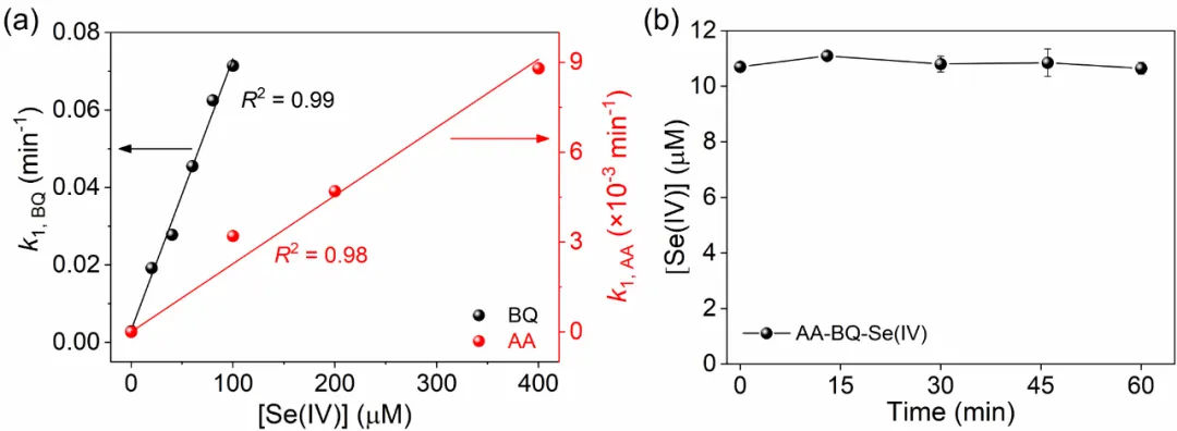 correlation between k1, BQ or k1, AA and [Se(IV)]. (b) Evolution of Se(IV) in AA-BQ-Se(IV) mixture. [AA] = [BQ] = 200 μM, [Se(IV)] = 10 μM, pH