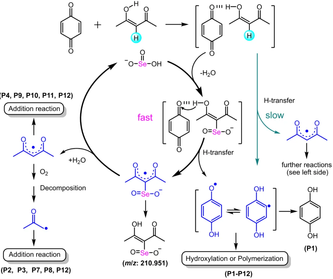 Acetylacetone Deciphered the Enhanced Inhibition on Microcystis aeruginosa Growth”的研究论文(DOI: 10.1021/acs.est.2c09682),报道了亚硒酸盐(Se(IV))协同强化乙酰丙酮(AA)抑杀铜绿微囊藻的现象,并基于对AA抑藻机制的分析,以Se(IV)-AA-醌三元体系为研究对象,通过三元体系中的各物质转化反应的研究,揭示了Se(IV)催化AA与醌之间氢原子转移反应的分子机制。这一催化机制为上述协同强化抑藻现象提供了可能的解释。这是关于Se(IV)作为醌类物质与氢供体之间电子转移反应催化剂的首例报道,具有重要的科学意义。此外,Se(IV)对AA抑藻的协同强化效应也能为有害蓝藻水华的治理提供参考。蓝藻水华是一个全球性的重大生态环境问题。论文根据主要致水华蓝藻——铜绿微囊藻在单独添加Se(IV)或AA以及两者共存条件下的生长曲线、有效光合量子产率(Φe)和最大相对电子传递速率(rETRmax)的差异,确认Se(IV)能够协同AA干扰蓝藻的光合电子传递,提升抑藻效果。AA抑藻的关键位点之一是光合系统中的醌电子受体。因此,本文研究了Se(IV)-AA-醌三元体系中的转化反应,发现Se(IV)对醌与AA等氢供体(如抗坏血酸、半胱氨酸)之间的电子转移反应具有催化作用。结合构效关系和产物解析,论文提出了Se(IV)催化AA与苯醌(BQ)氢原子转移的分子机制。这一研究所揭示的Se(IV)、AA(或其它环境氢供体)和醌之间的化学过程具有重要的环境和生物学意义。具有可逆电子传递能力的醌在光合和呼吸系统中发挥着关键的作用。课题组此前的研究表明在光、暗两种条件下,AA均可参与醌、氢醌的电子传递(Environ.