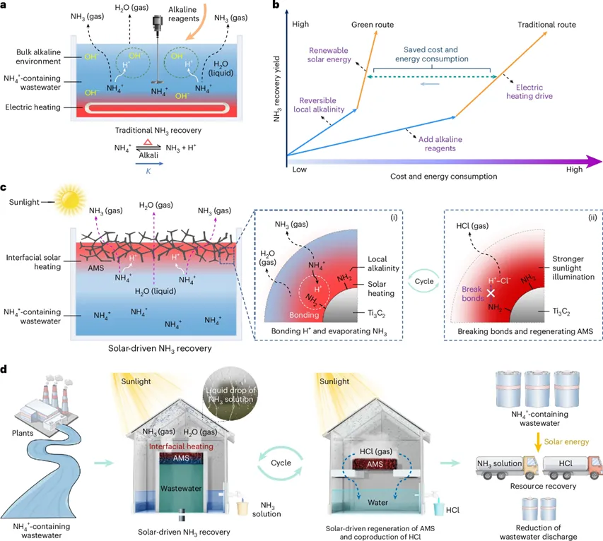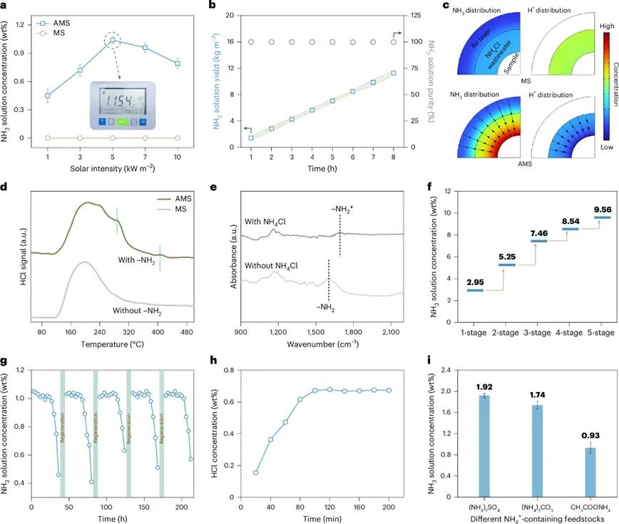 本研究利用该AMS在5 sun自然光下(无需投碱和外部加热)8h即可实现0.6 molm⁻²h⁻¹、纯度99.8%的NH₃高通量回收,并在光强升至15 sun时通过-NH₂·H⁺键的热解“一照再生”材料,同时获得10wt%的NH₃溶液与0.67wt%的盐酸,构建了完整的“吸氨-吐酸”闭环流程。