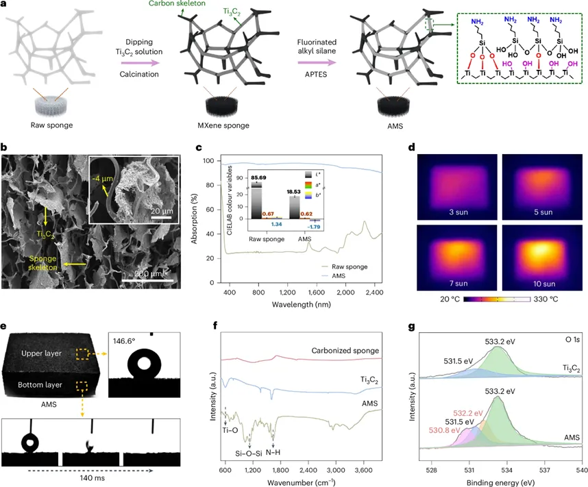 本研究构筑了可漂浮的AMS,在Ti₃C₂ MXene宽带光热骨架上高密度接枝-NH₂,形成疏上亲下的Janus结构,使海绵漂浮于水-气界面时能够同时捕获H⁺并定域升温,从而在热力学(平衡右移)和传质(挥发加速)两方面协同提升NH₃挥发速率。