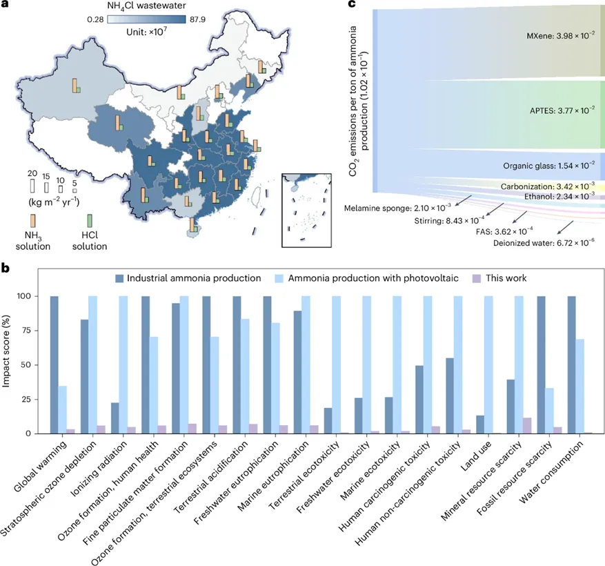 本研究的生命周期评估表明,该太阳驱动策略生产1 t NH₃仅排放0.102 tCO₂-e(显著低于Haber-Bosch的3.27 t和光伏-电氢路线的1.13 t),而技术经济分析预测AMS可实现年净利润91.3 USDm⁻²、投资回收期约3.5年,展现了兼具减碳与盈利的绿色氮循环范式。