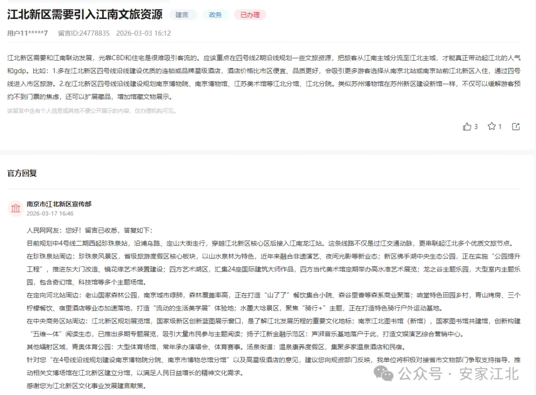随后江北新区宣传部回复:针对您“在4号线沿线规划建设南京博物院分院、南京市博物总馆分馆”以及高星级酒店的意见,建议您向规资部门反映,我单位将积极对接省市文物部门争取支持指导,推动相关文博场馆在江北新区建立分馆,以满足人民日益增长的精神文化需求。