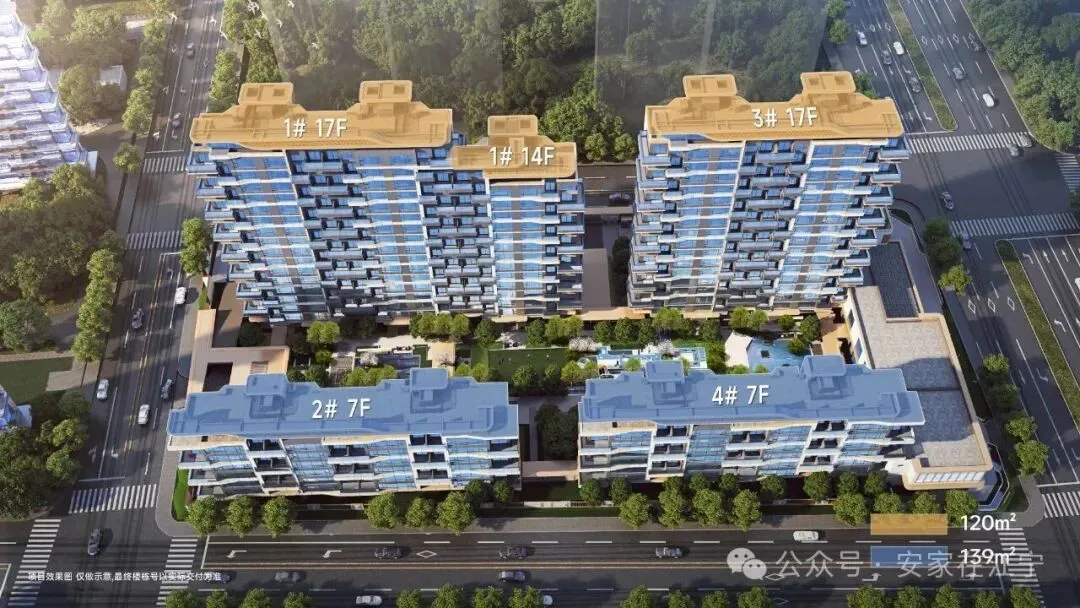 项目规划4栋7-17F低密住宅,其中2栋洋房,户型建面约139㎡;2栋小高层,户型建面约120㎡,一共202套,户户得房率超100%。