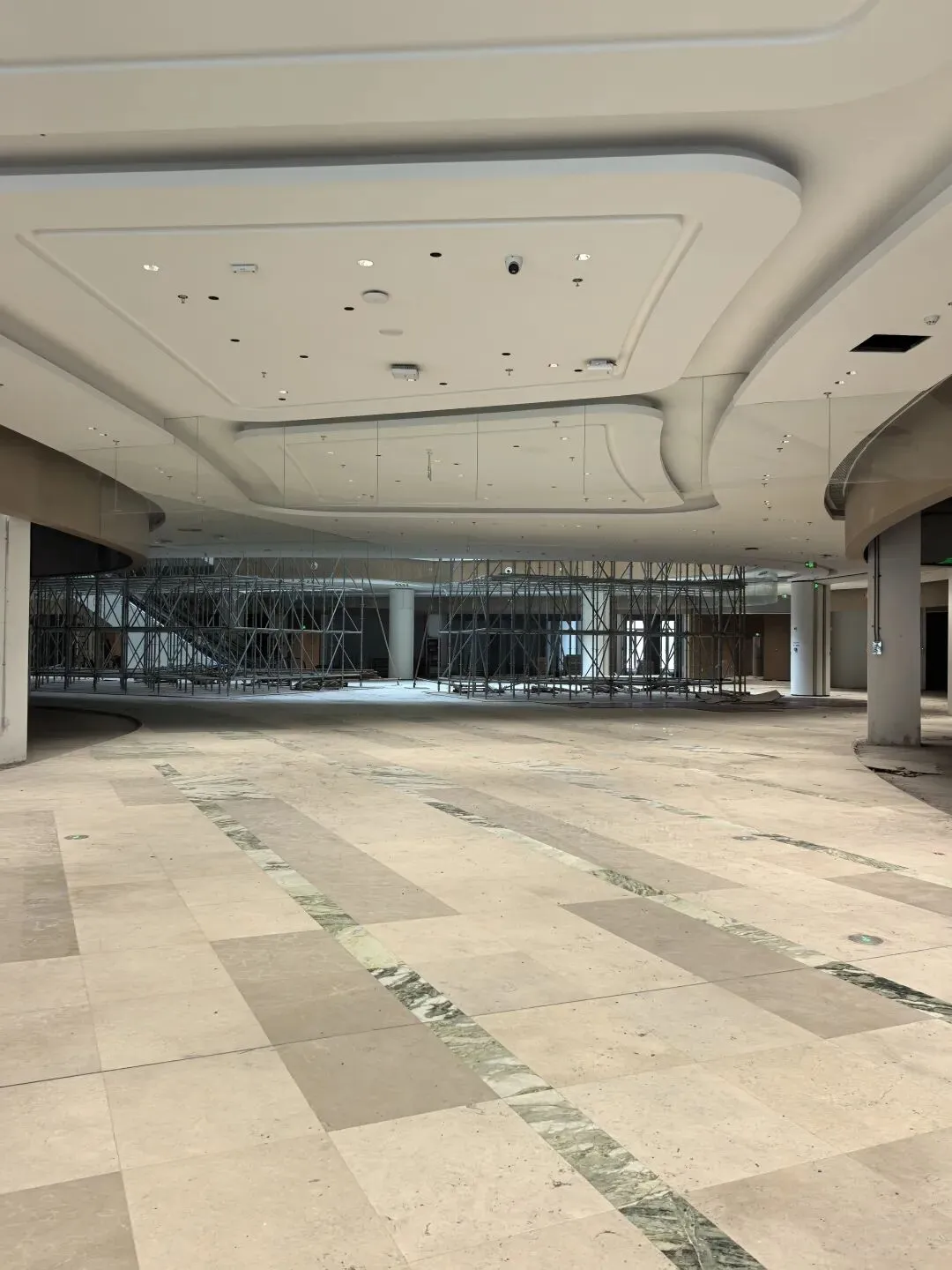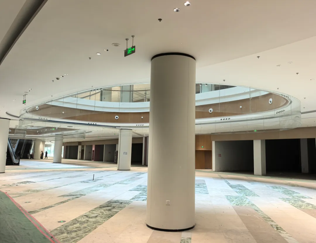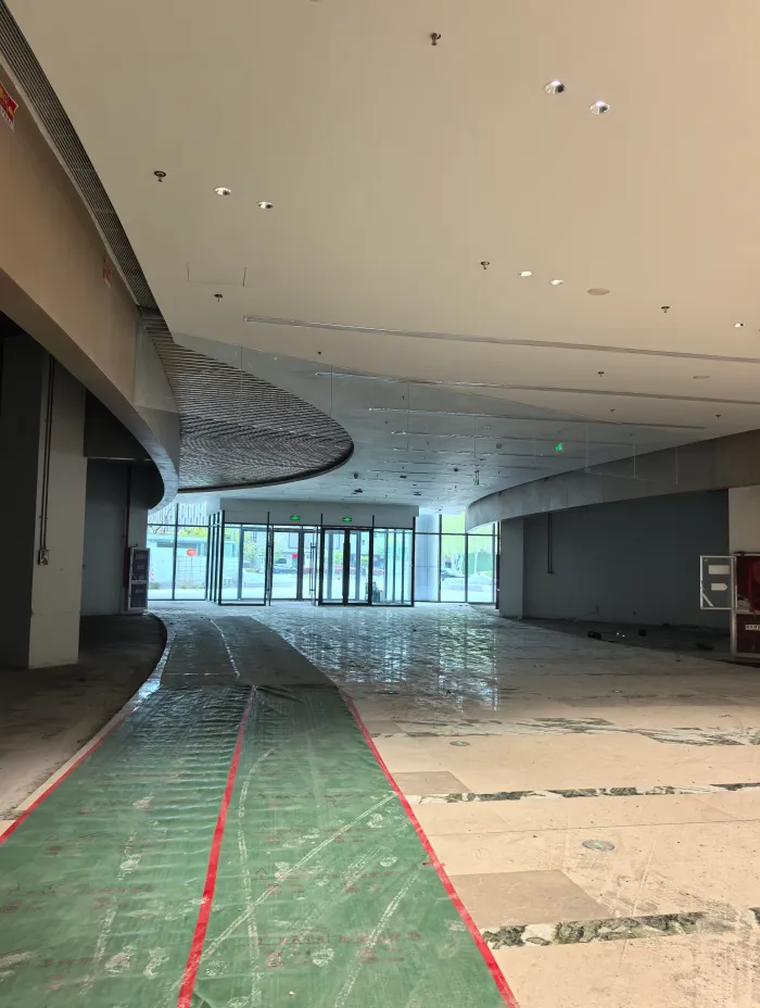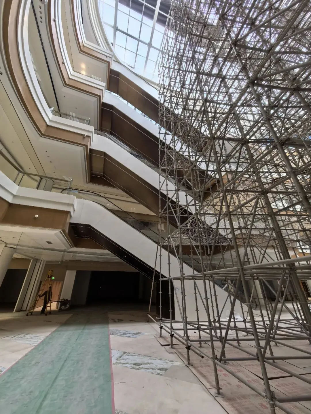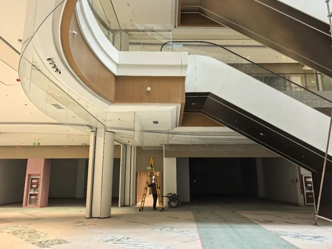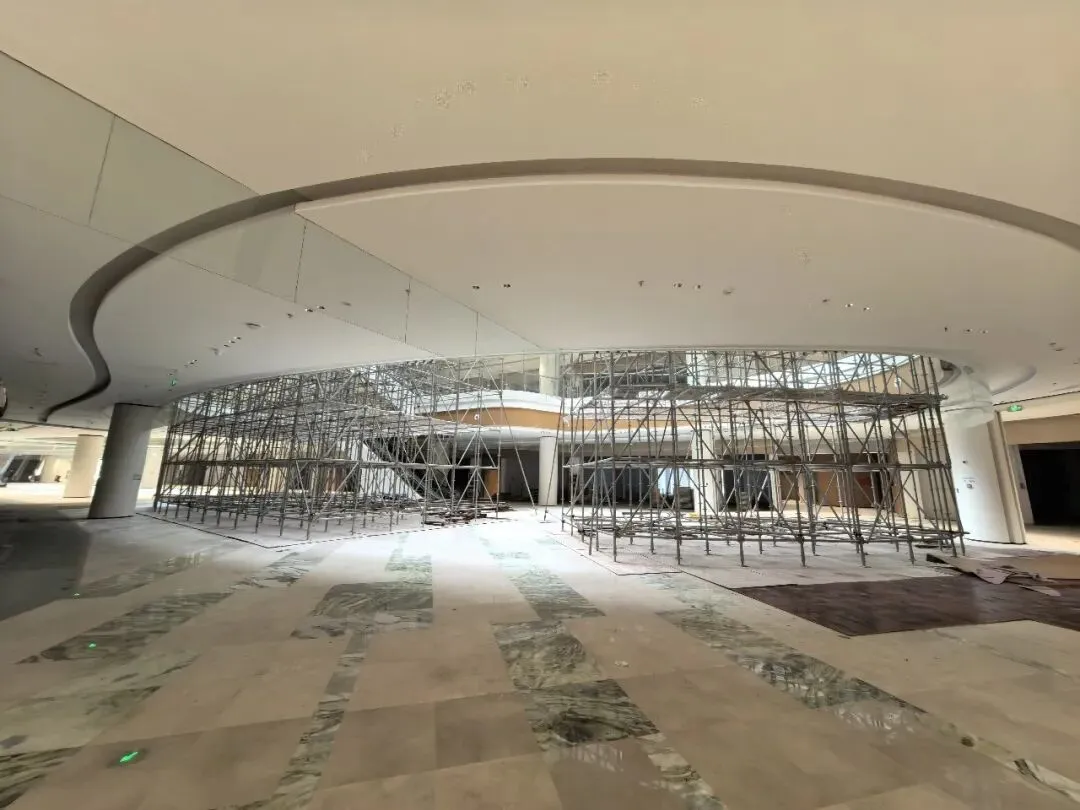进入商场内部后,我看到有工人正在施工,现场还设有工程架,方便进行内装工作。