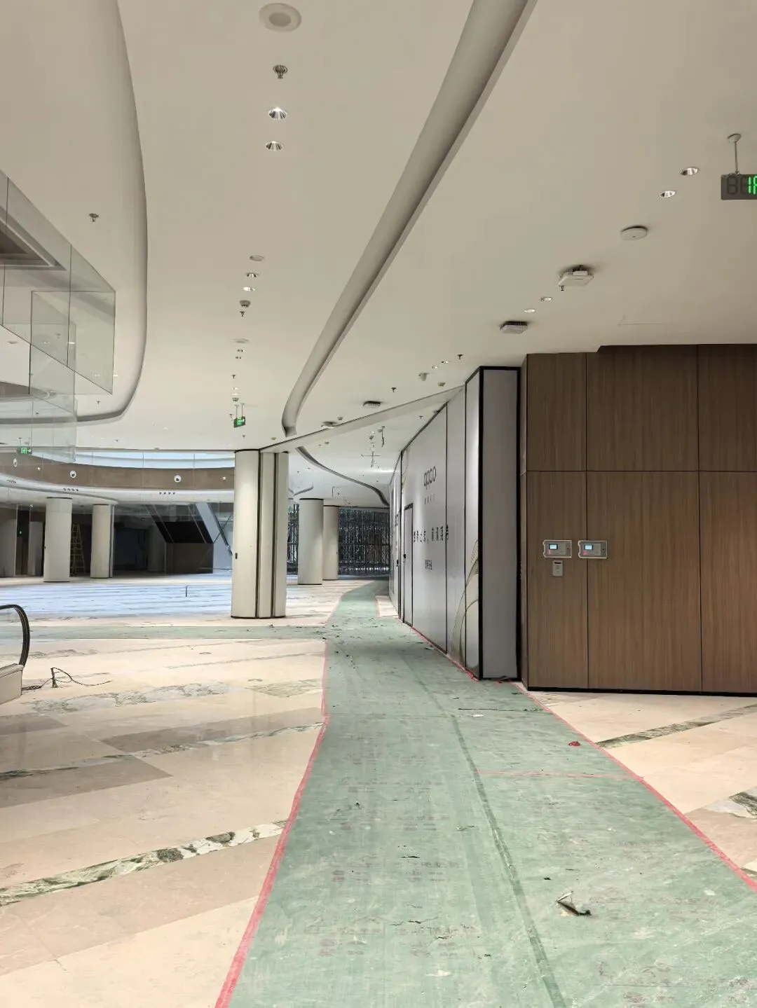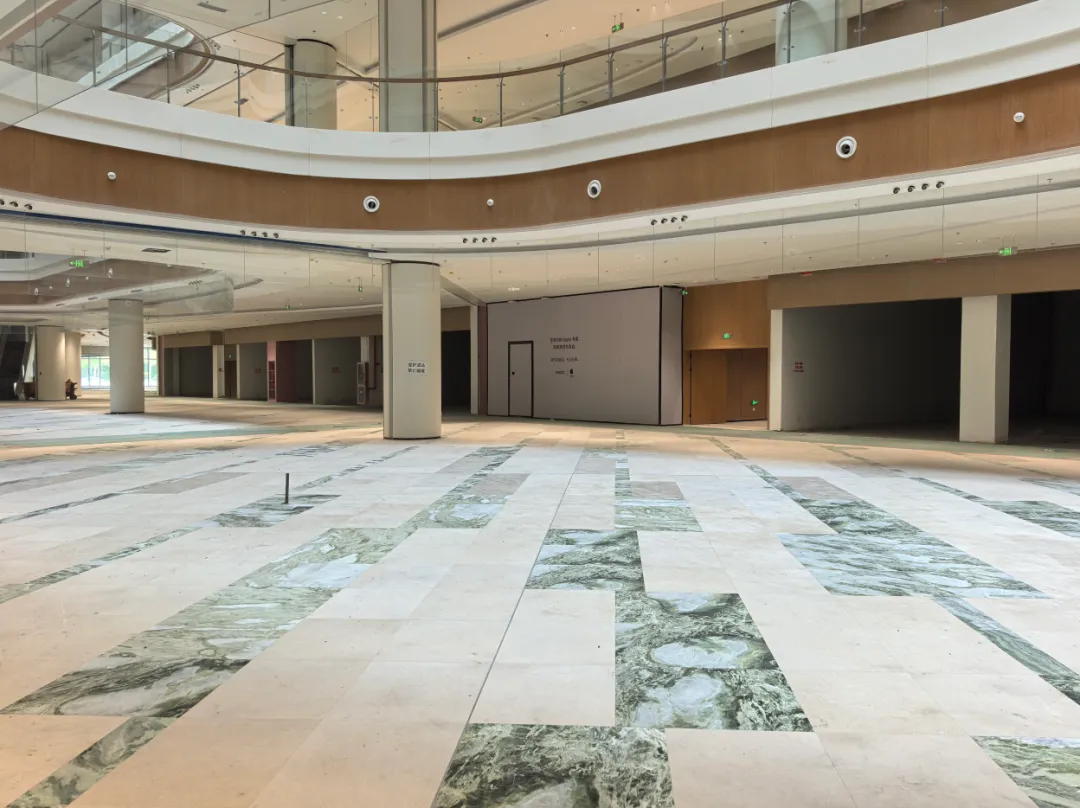 商场地面已经基本完工,运用了绿色、米灰色和米白色拼接,颜色跳跃,颇为特别。