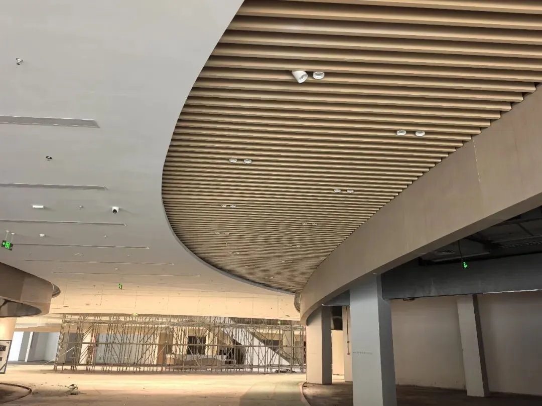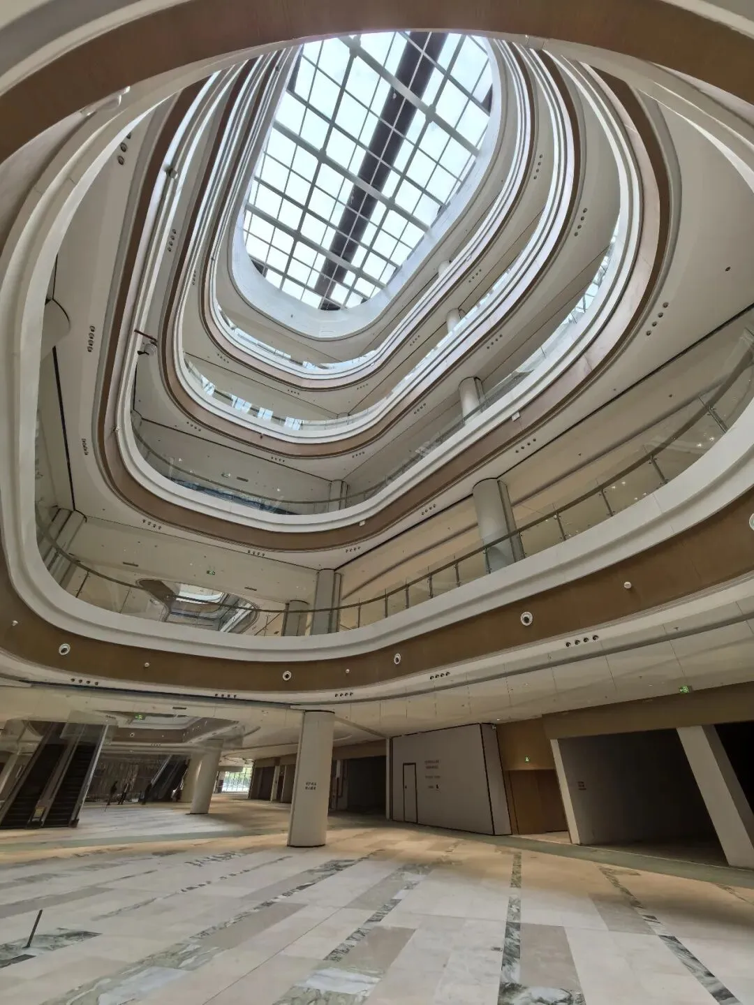 商场顶部主色调为白色与香槟金,有弧形吊顶也有方型吊顶,整体设计感较为流畅。