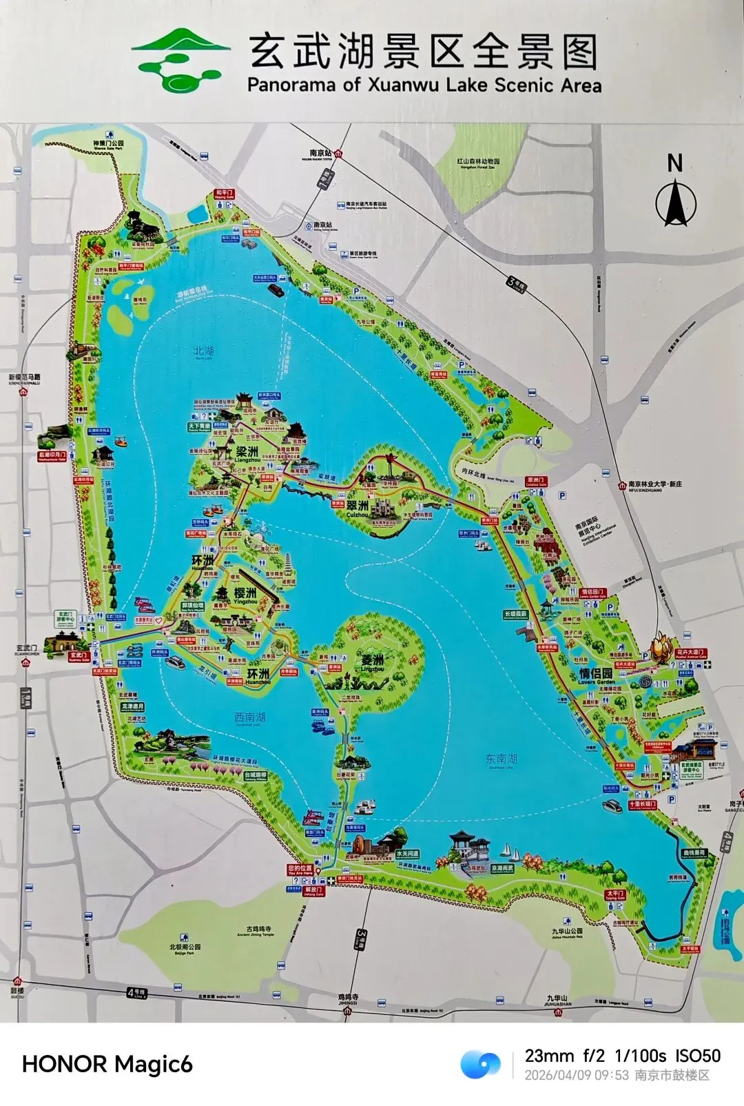 玄武湖紧临南京站南广场,东西南依次环绕着紫金山、明城墙、鸡笼山。六朝时期为皇家园林湖泊, 明代是保存黄册的国家档案馆,被誉为“金陵明珠”。整个景区由“五洲(环洲、樱洲、梁洲、菱洲和翠洲)”、“一园(情侣园)”、“一路(环湖路)”。