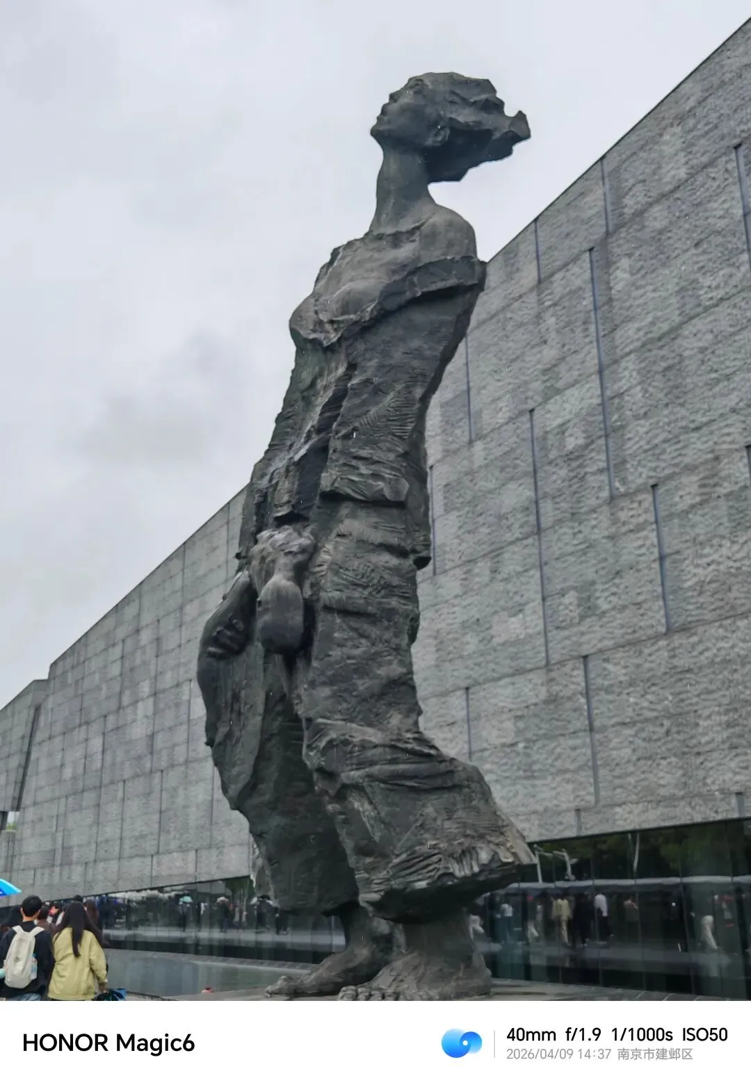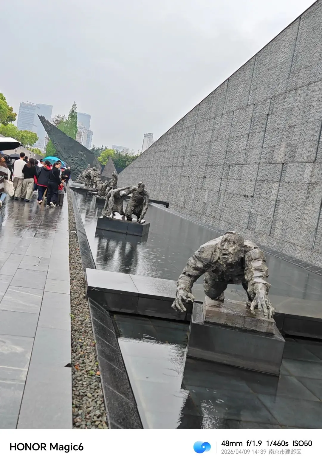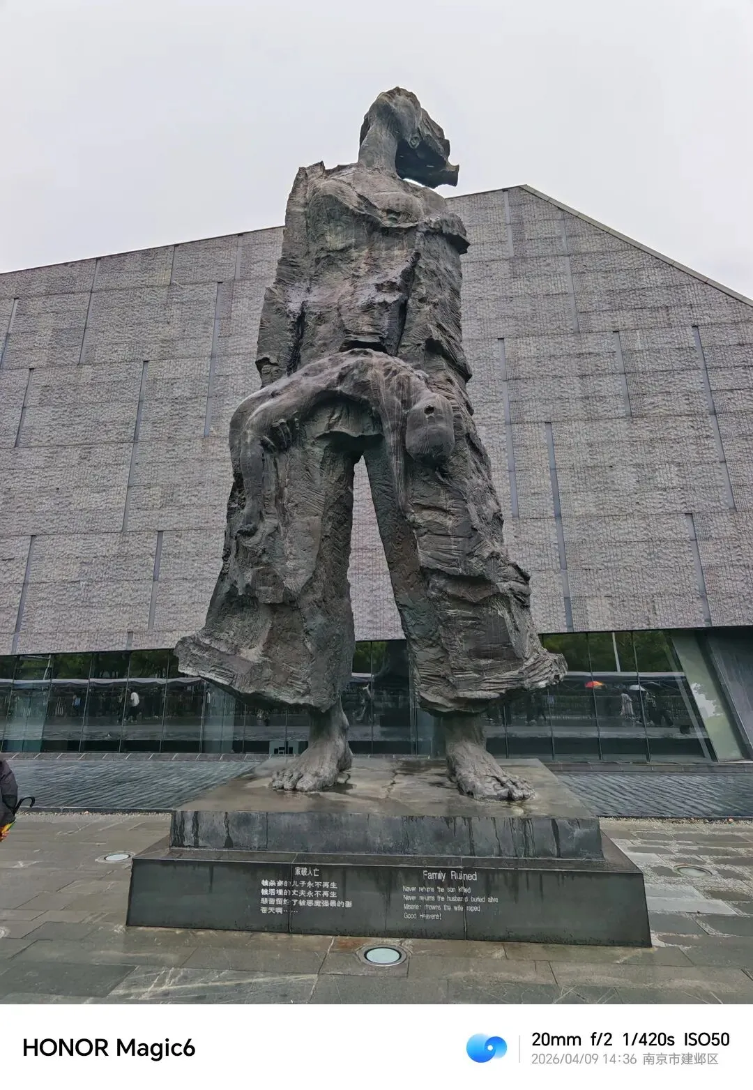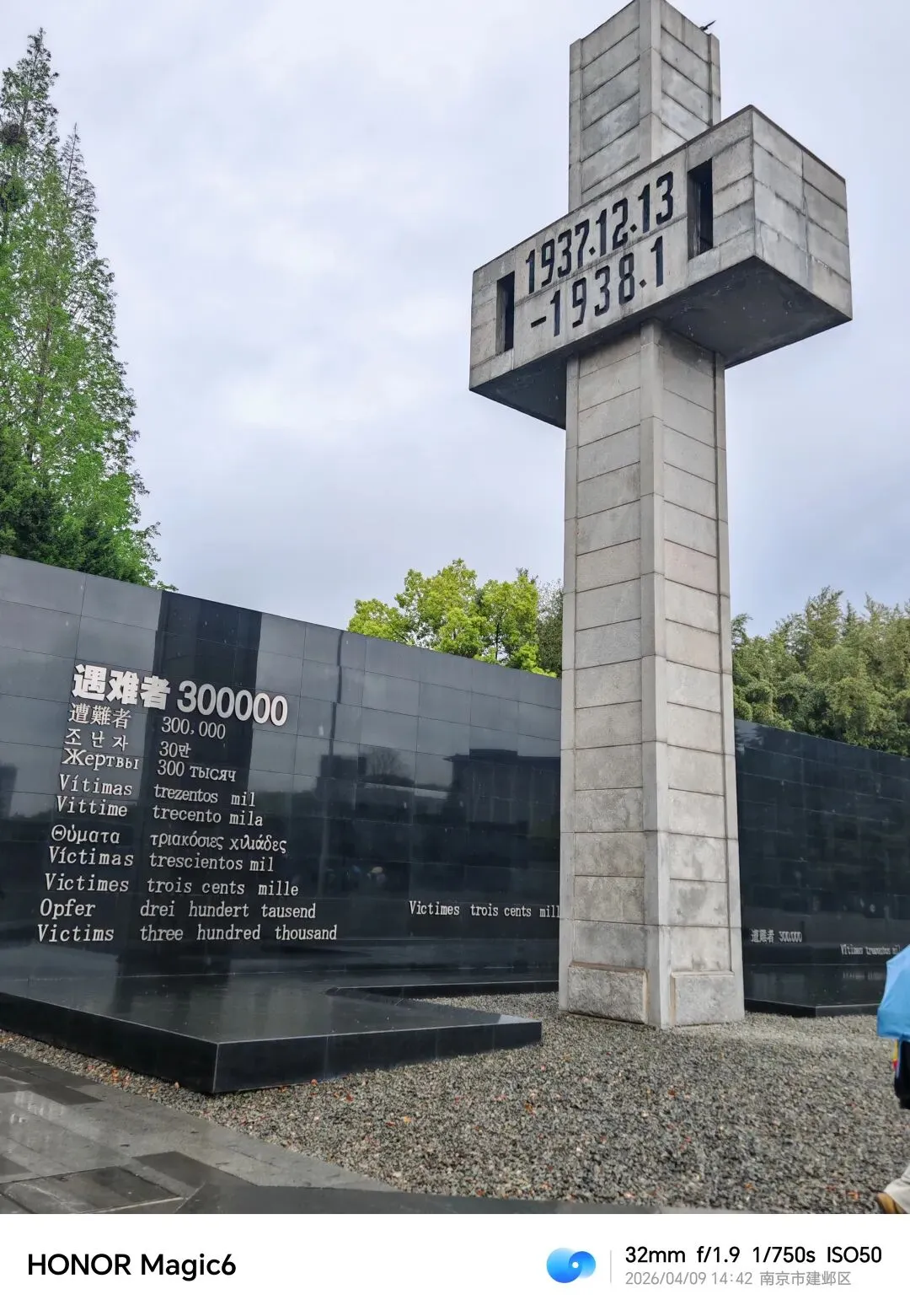 这是个沉重的参观过程。霏霏细雨的天气正合参观的心情,湿漉漉,阴沉沉。馆前那著名雕塑——一位失去丈夫的母亲昂首向苍穹,手里垂抱着没有生命的孩子…那种震撼是透彻心扉的!然后是一组逃难-死亡的石雕!高高的十字架上时间定格在“1937.12.13-1938.1”,侧面大石壁30万的数字异常骇目。