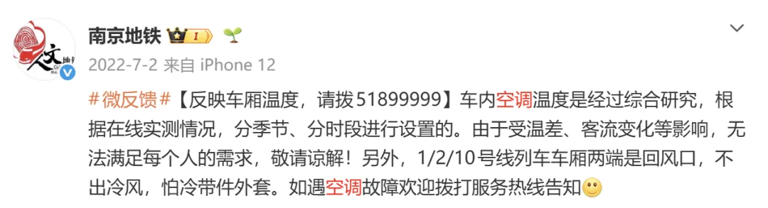 当别人避雷南京地铁的空调太冷或太热时,它是这么回复的: