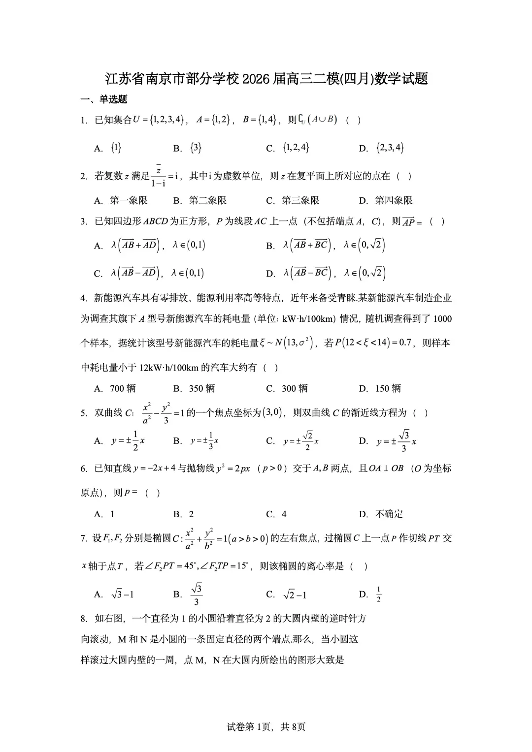 >2026届江苏省南京市部分学校高三二模数学+历史试题+答案(2026.4)