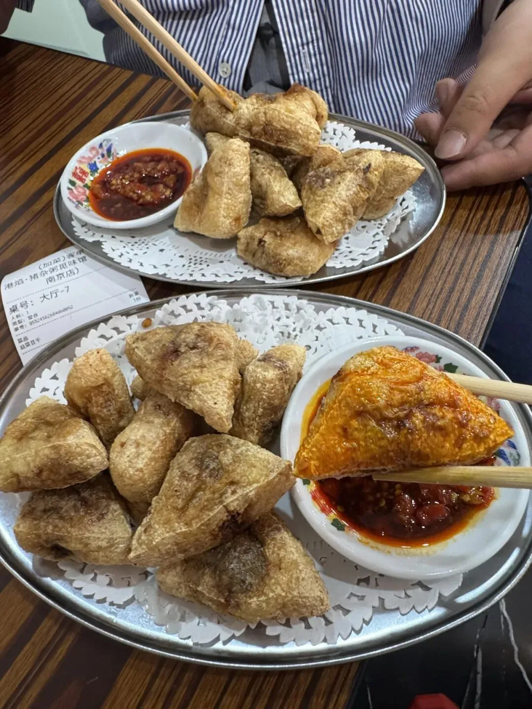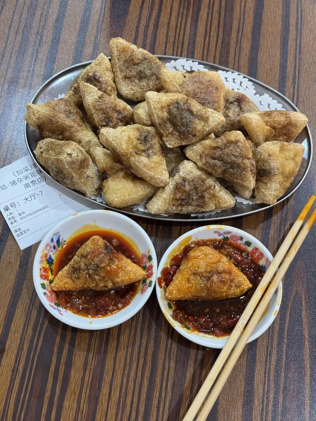夹一个还烫手呢,蘸上店里配的辣酱,咬一口我的妈,咔嚓一声脆!外壳酥得掉渣,我本来以为就是实心炸豆干,咬开直接给我惊艳到了,居然塞满了韭菜馅啊!满满的全是,鲜得不行,韭菜的清甜全都锁在里面,软乎乎的还带点汁水,和脆外壳搭在一起,口感太绝了。