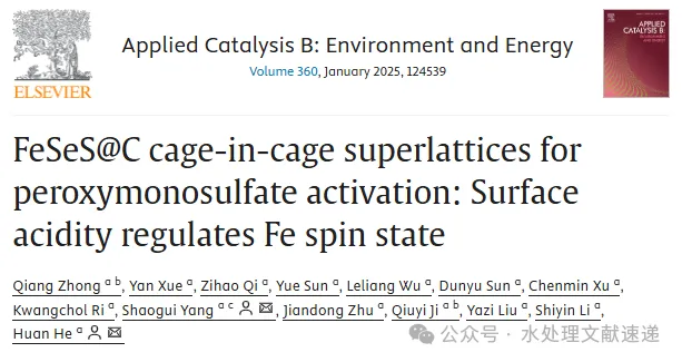 Qiang Zhong, Yan Xue, Zihao Qi, Yue Sun, Leliang Wu, Dunyu Sun, Chenmin Xu, Kwangchol Ri, Shaogui Yang, Jiandong Zhu, Qiuyi Ji, Yazi Liu, Shiyin Li, Huan He, FeSeS@C cage-in-cage superlattices for peroxymonosulfate activation: Surface acidity regulates Fe spin state, Applied Catalysis B: Environment and Energy, 2025, https://doi.org/10.1016/j.apcatb.2024.124539