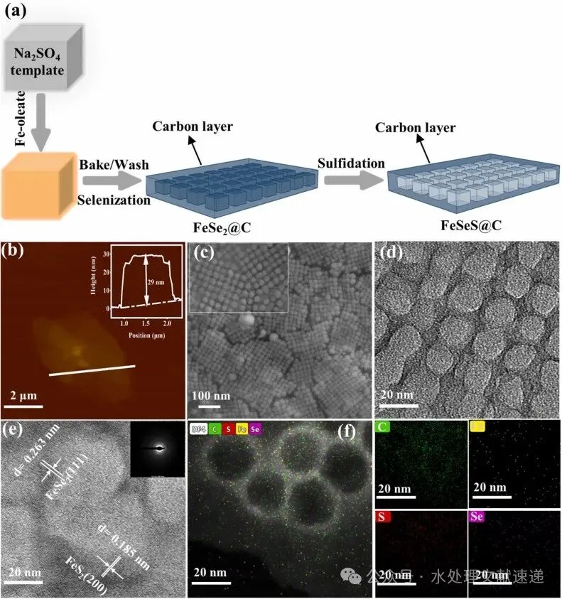 Fig. 1. (a) Synthesis process for FeSeS@C-4 cage-in-cage superlattices, (b) atomic force microscopy (AFM) image and its height profile (inset), (c) scanning electron microscopy (SEM) and its magnification (inset), (d) transmission electron microscopy (TEM), (e) high-resolution TEM (HRTEM) and FFT image (inset), (f) STEM image and corresponding elemental mapping of FeSeS@C-4 superlattices.