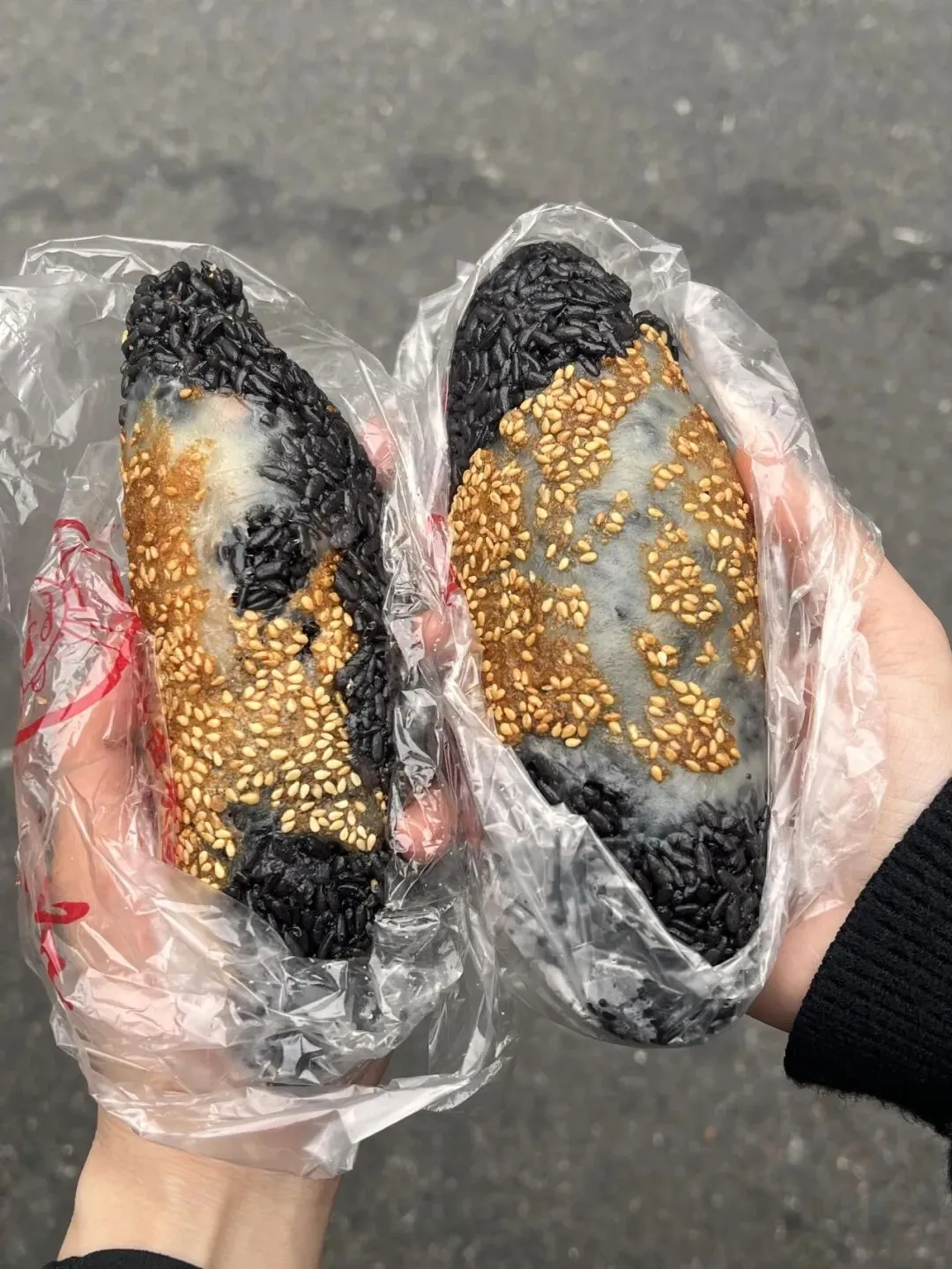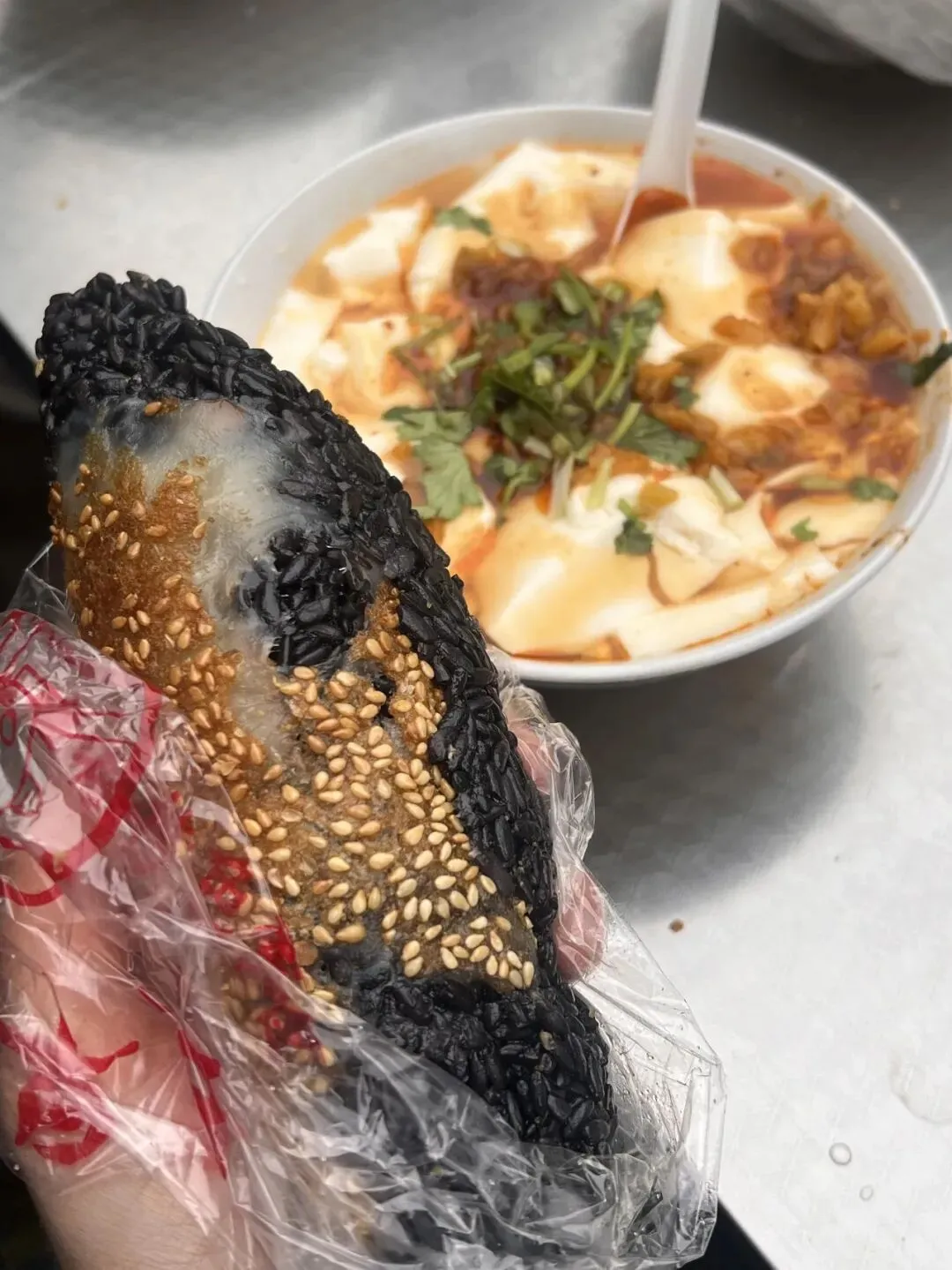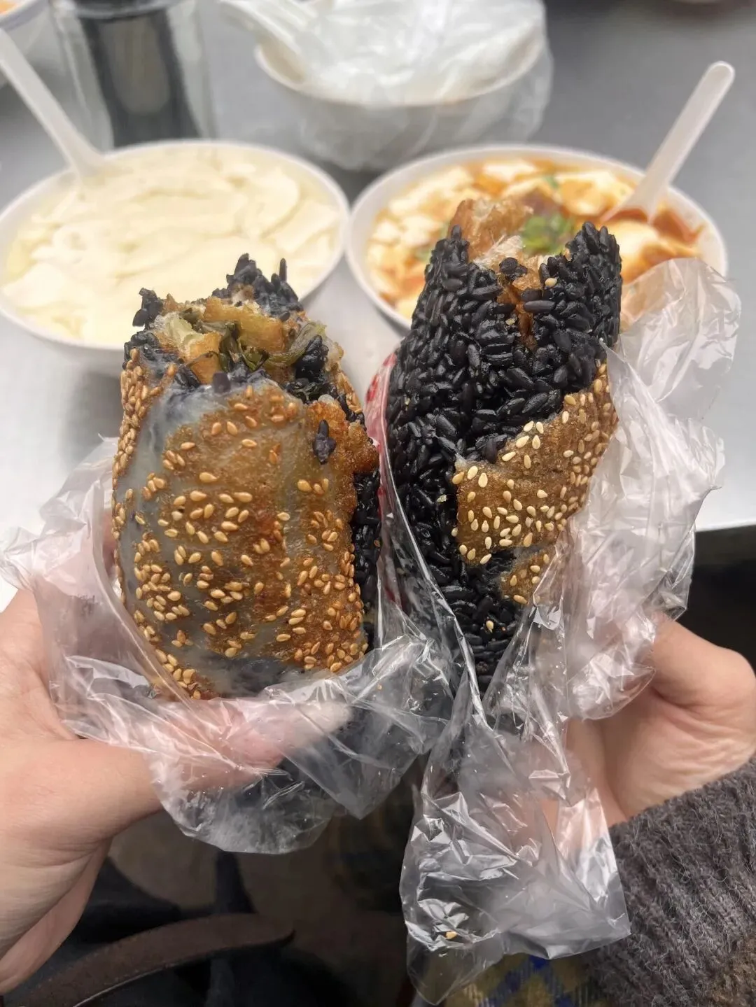 看着黏糊糊黑乎乎的,表面粘满了白芝麻,拿在手里软乎乎还烫手,我一开始还半信半疑,这能好吃吗?纠结了半天还是买了俩,顺带打了碗咸豆腐脑,没花多少钱。