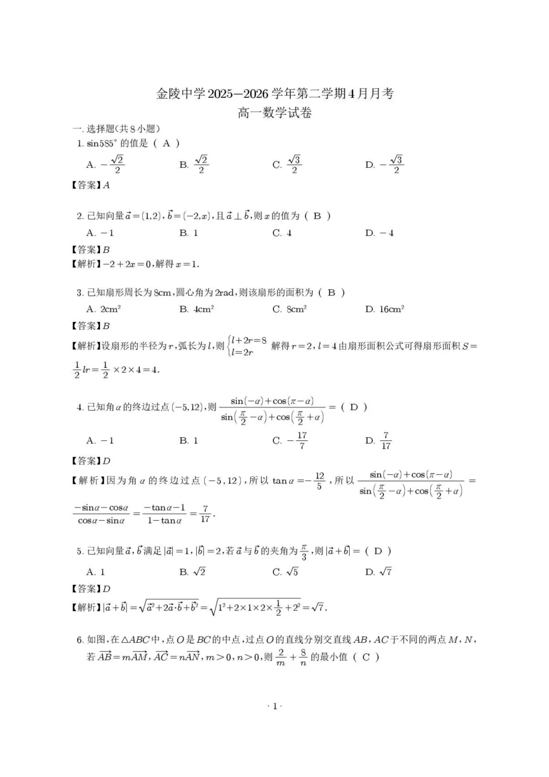 作者寄语:江苏南京金陵中学2025-2026学年高一4月月考数学试卷+答案,7天有效领取,手慢无!!!