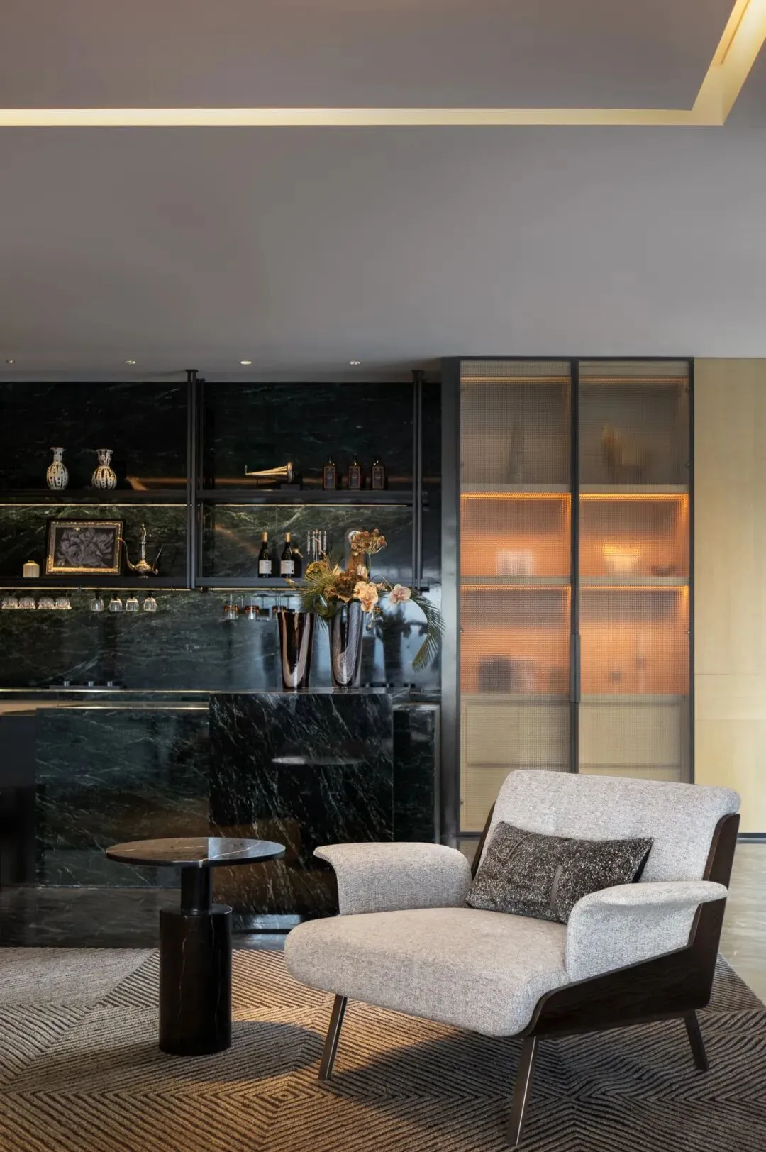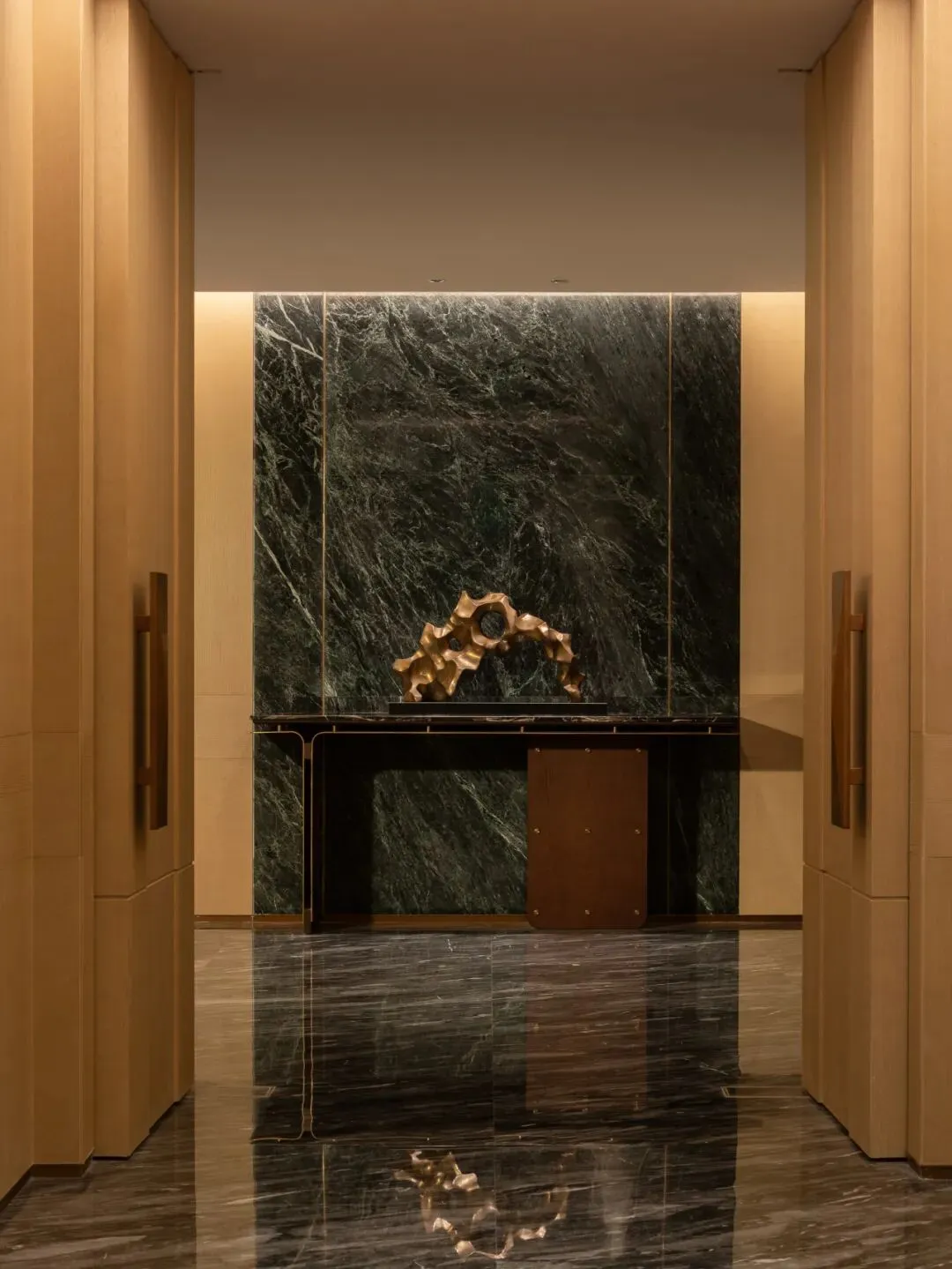 空间故事,从前厅开始铺陈。设计师巧妙运用金属、天然石材与玻璃的叠合,打造出既内敛稳重又蕴含力量的视觉画面。