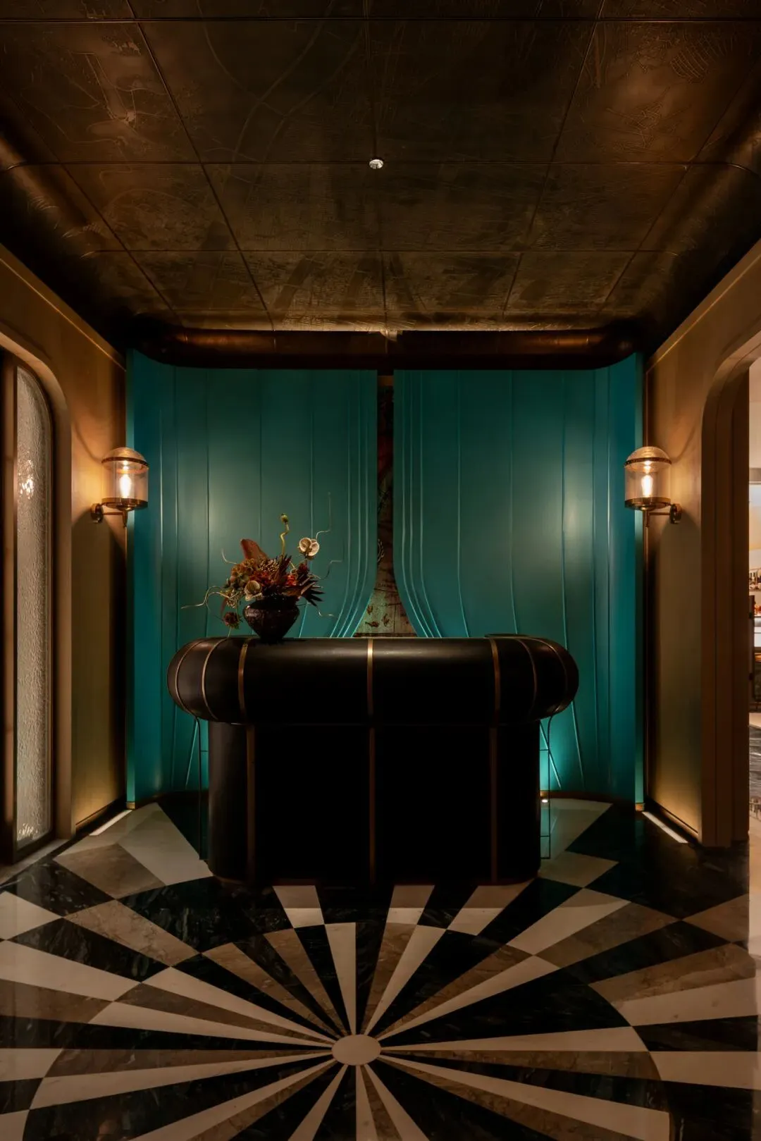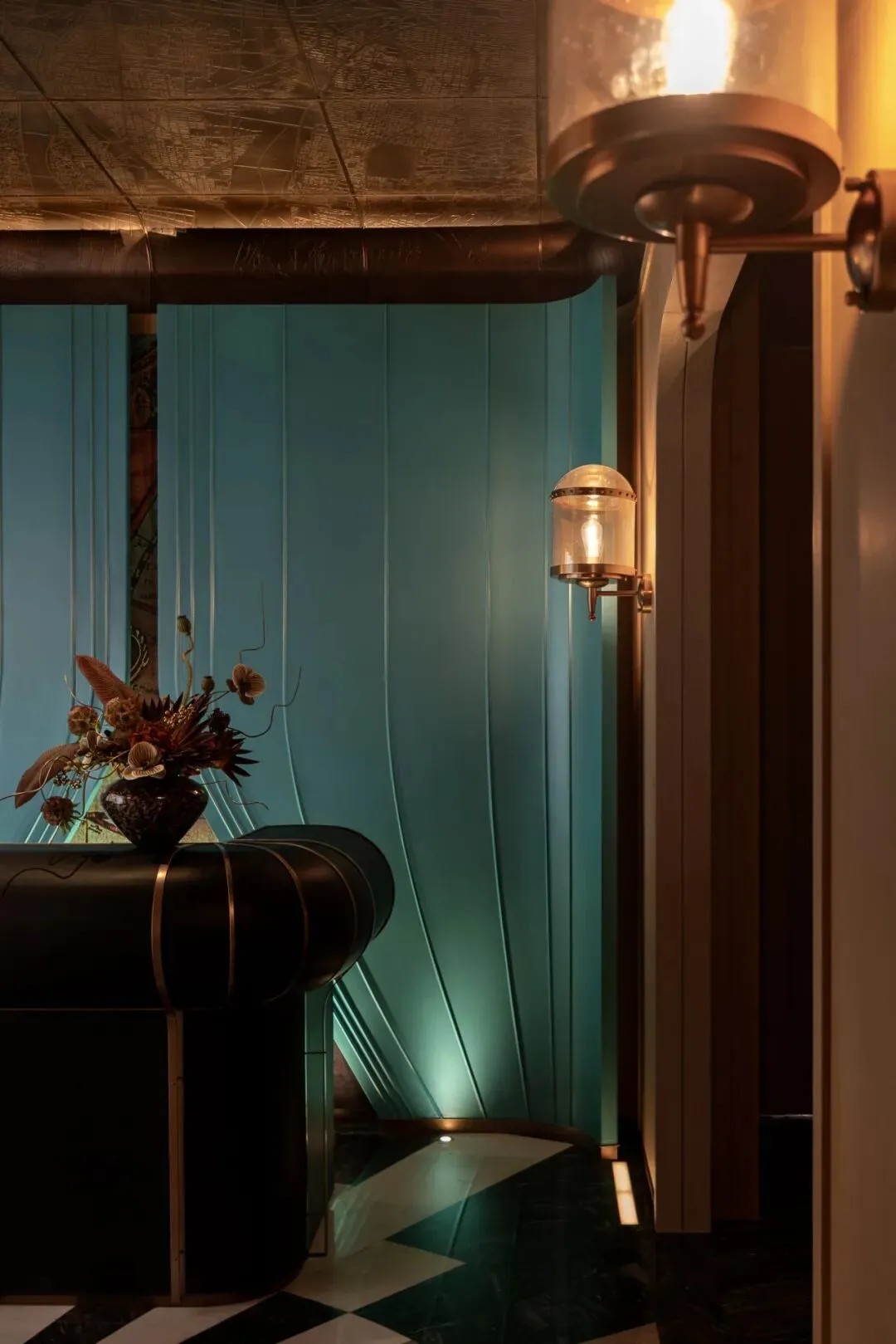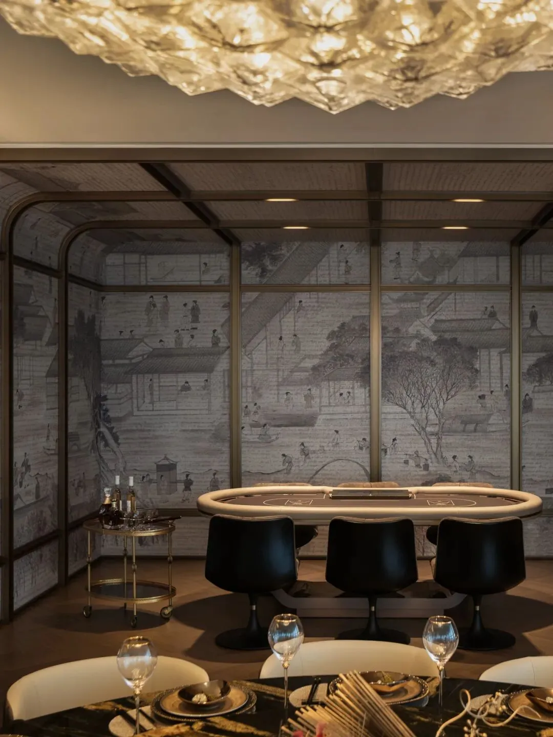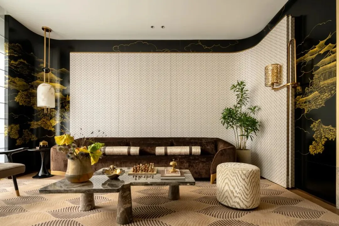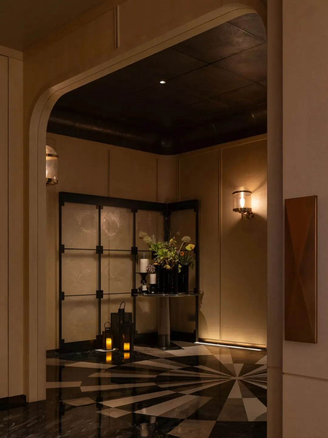 整个空间利用金箔与漆器元素共同点缀,形成一种收放自如的精致格调。人们身处其中,既能体会到高雅品位,又不会感到拘束,营造出"得体舒适"的空间氛围。