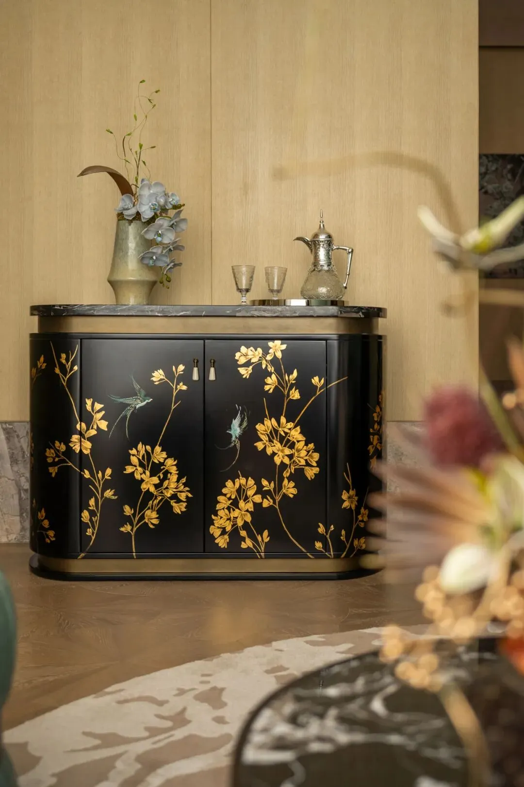 深色的柜体配以金色纹饰,仿佛传统漆器艺术在当代空间中的新生。当这些元素与舒适的沙发、雅致的挂画相互搭配,便营造出“闹中取静”的独特氛围。