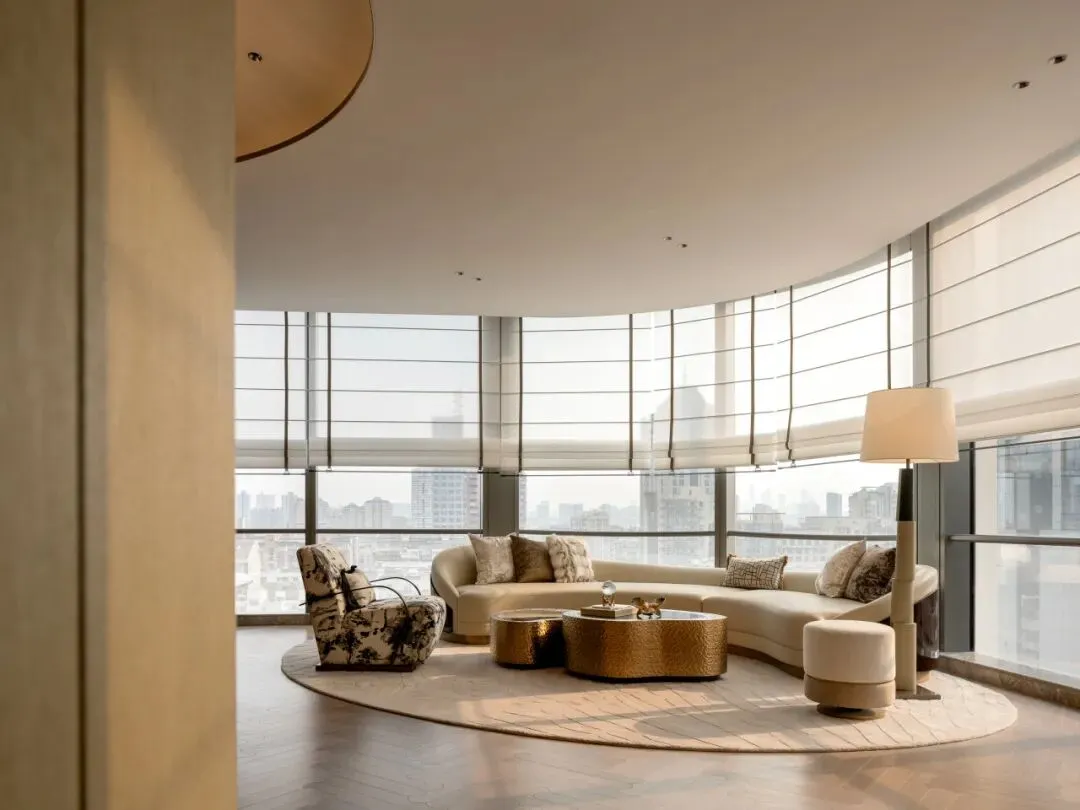流畅的弧形沙发搭配线条利落的茶几,共同营造出和谐的空间韵律,东方的婉约美感与现代的设计风格在这里自然交融。