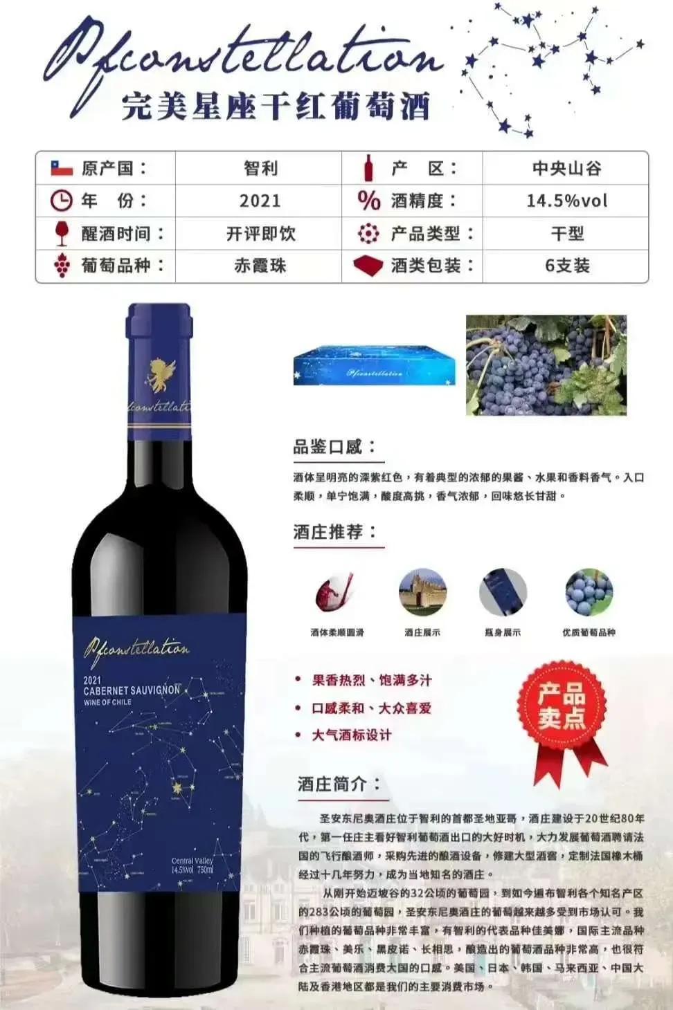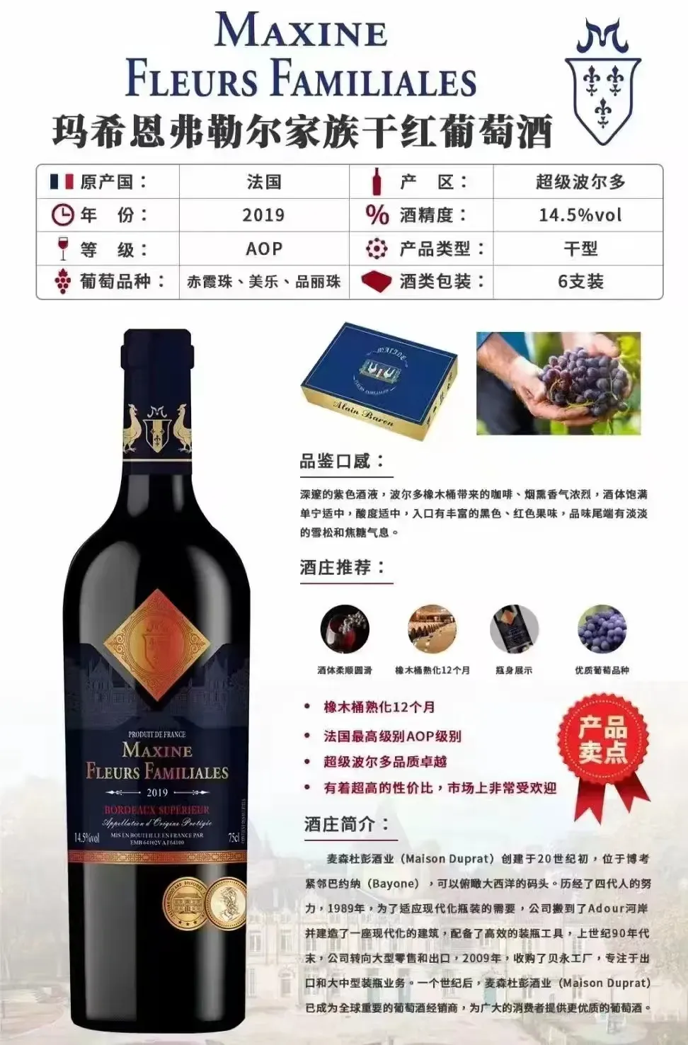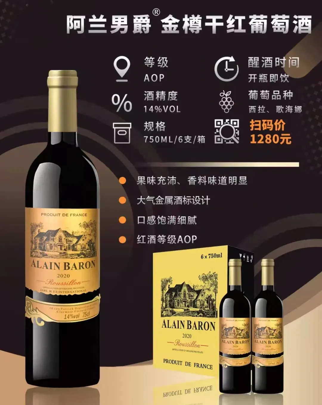 原产地:法国。葡萄品种:西拉、歌海娜。酒精度:13.5度。这款红酒果味充沛,香料味道明显。口感饱满细腻。红酒等级AOP。一箱六瓶,每瓶750ml,240元每箱,量大价更优。洛阳市区免费送货:18937901515 诚寻全国代理商,欢迎合作!