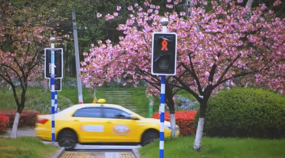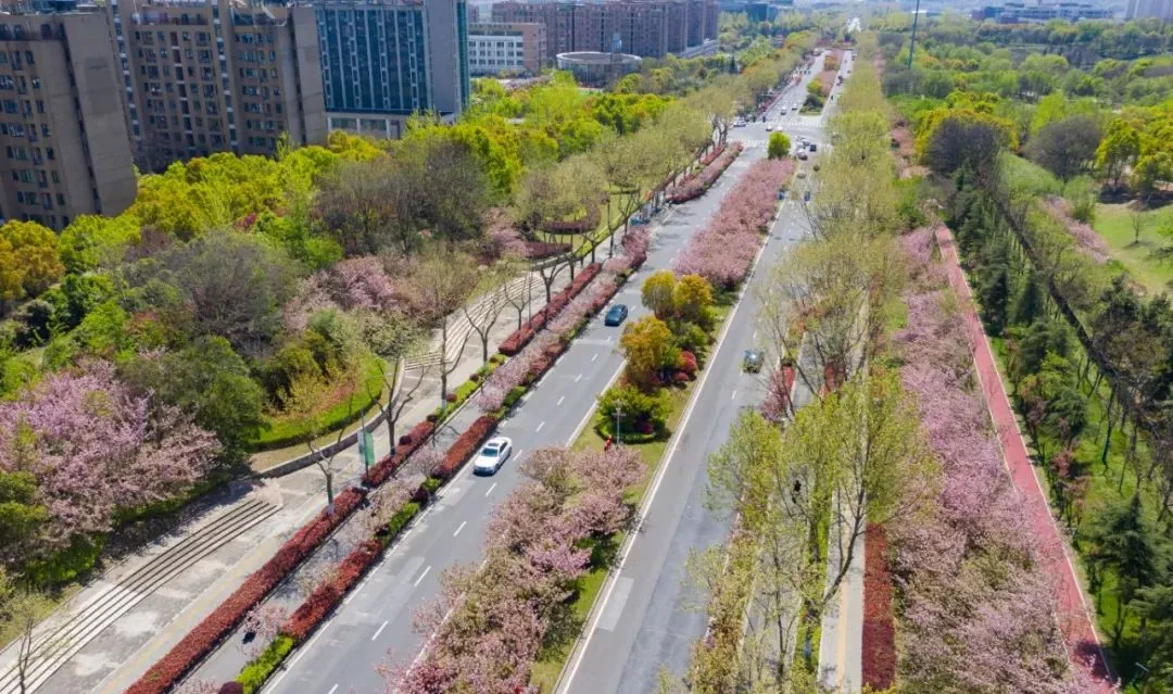道路中分带和两侧侧分带分别种植了香樟、垂丝海棠、红叶石楠及金边黄杨等绿植。其中,垂丝海棠种有1000多株。