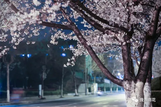 就算是夜晚,也挡不住樱花大道的梦幻。在大道的两侧,还搭配着意杨、雪松、紫叶李、紫薇等植物1700株。春日驱车至此,满满都是甜蜜气息。