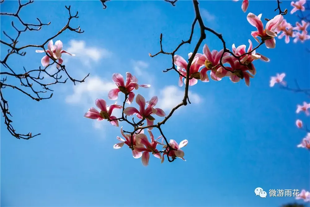 这里的玉兰花,总于幽僻处带着雨后简净的香气,并不理会有没有人来欣赏,蓝天白云的映衬下,玉兰尽显娇艳。