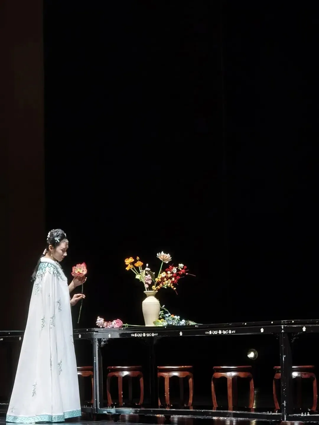 幕布是沉沉的黑。忽然,有光打下来,幽幽的,照见台上那张长长的条桌。十二个女子,穿着各色衣裳,手里拿着一枝花,一个一个地走上前来,把手中的花插进桌上的瓶子里,动作极慢,极轻,仿佛怕惊动了什么。我认得那是黛玉,那是宝钗,那是探春,那是湘云……书里头的人,忽然就站在你面前了,虽是远远的,虽是一句话也没有,却觉得那么真,那么切。