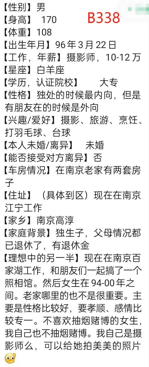 >南京脱单|96年,男,身高170,专科学历,摄影师工作,南京本地人,目前在江宁区