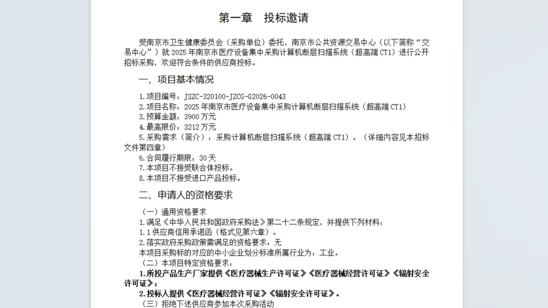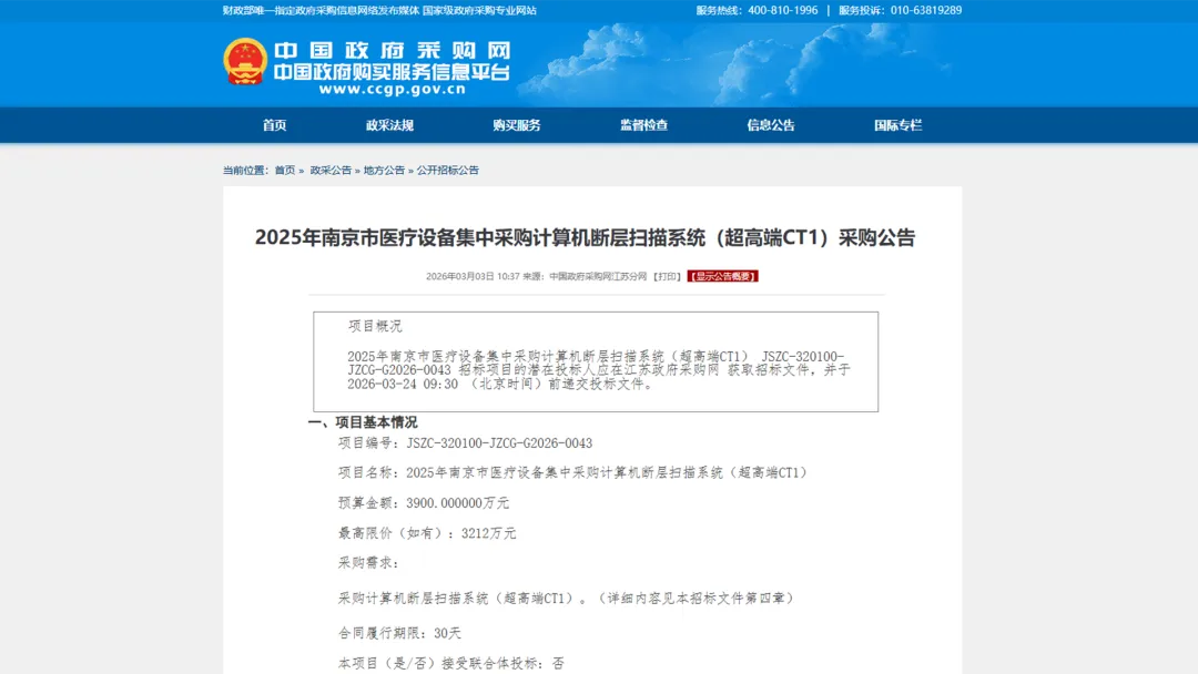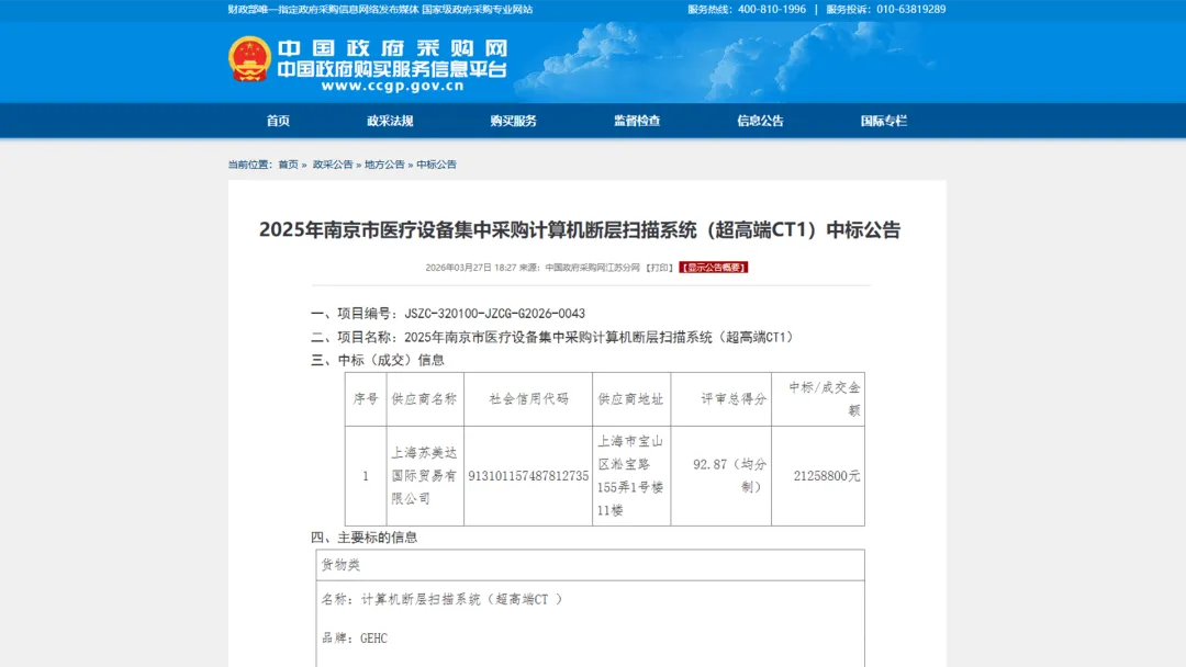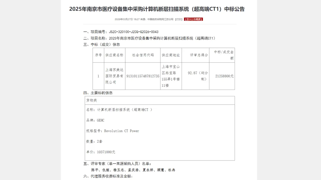 先跟大家伙儿捋一捋这事儿。简单来说,就是南京市政府今年要买两台顶级的计算机断层扫描系统,搞了个集中采购。最后,GE医疗拿下了这两台机器的供应权,中标型号是他们的Revolution CT Power,总价2125.88万元。