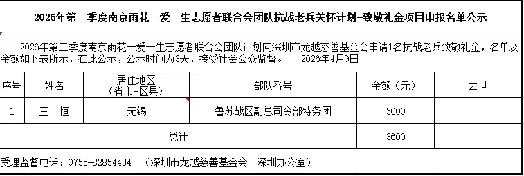 >2026年第二季度南京雨花一爱一生志愿者联合会团队致抗战老兵计划-致敬礼金项目申报名单公示