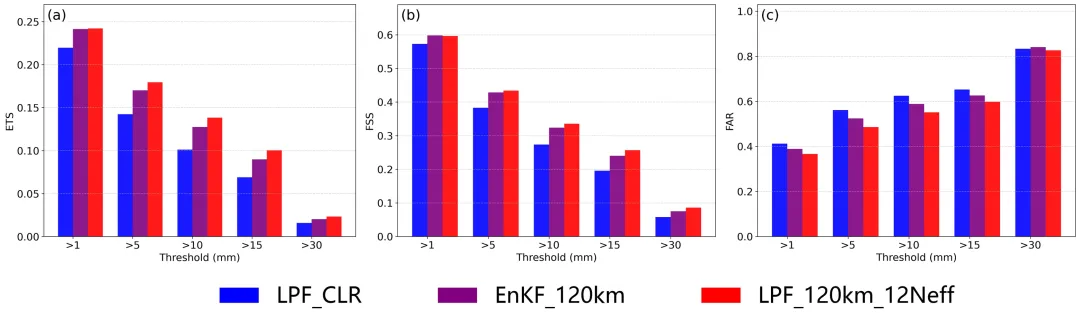 图 2 2023年7月29日18时至30日18时逐小时起报的0-24小时确定性预报在不同阈值下的平均降水技巧评分。蓝色表示仅同化晴空观测的LPF试验(LPF_CLR),紫色表示同化全天空观测的EnKF试验(EnKF_120km),红色表示同化全天空观测的LPF试验(LPF_120km_12Neff)。(a)ETS评分;(b)FSS评分;(c)FAR评分。
