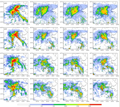 图 3 (a1-a4)3小时累积降水观测(填色;单位:mm),以及对应时段的(b1-b4)仅同化晴空观测的LPF试验、(c1-c4)同化全天空观测的EnKF试验和(d1-d4)同化全天空观测的LPF试验(填色;单位:mm)。第一行:2023年7月30日08时至11时;第二行:11时至14时;第三行:14时至17时;第四行:17时至20时。