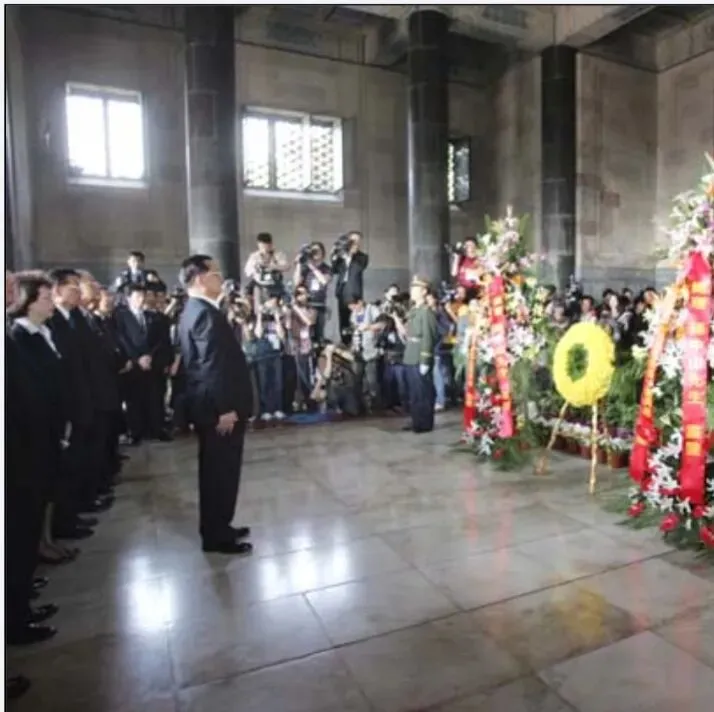 1949年后国民党主席首次谒陵,破冰之旅首站;拾级392级台阶,敬献花圈,默哀鞠躬,墓室凭吊。