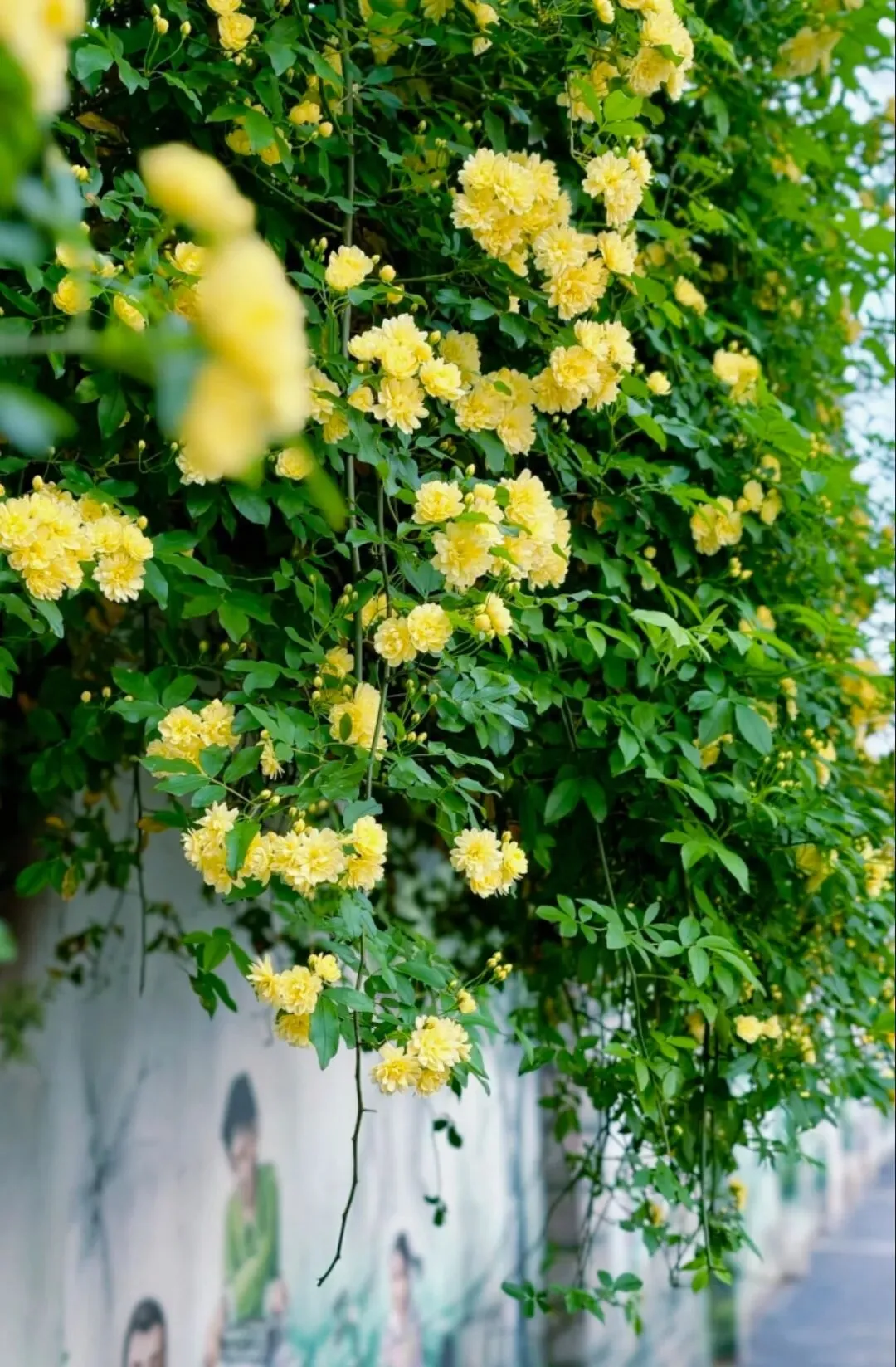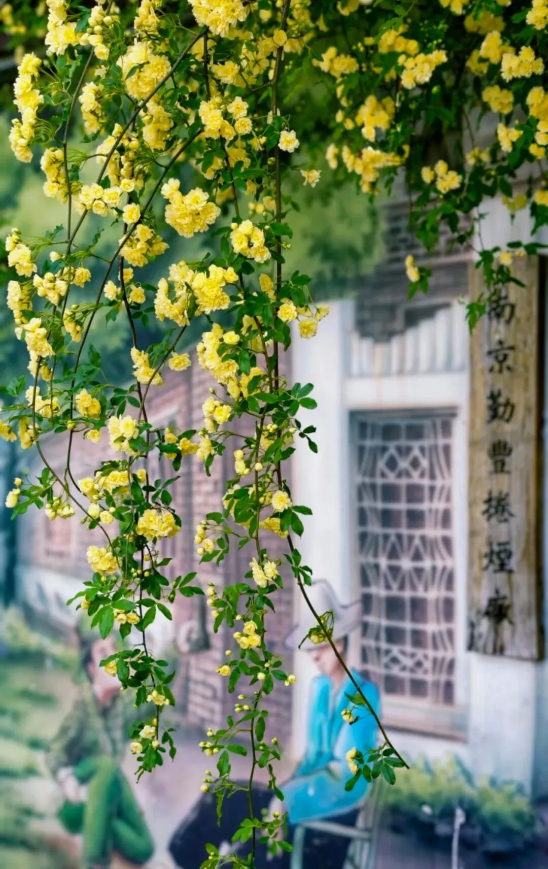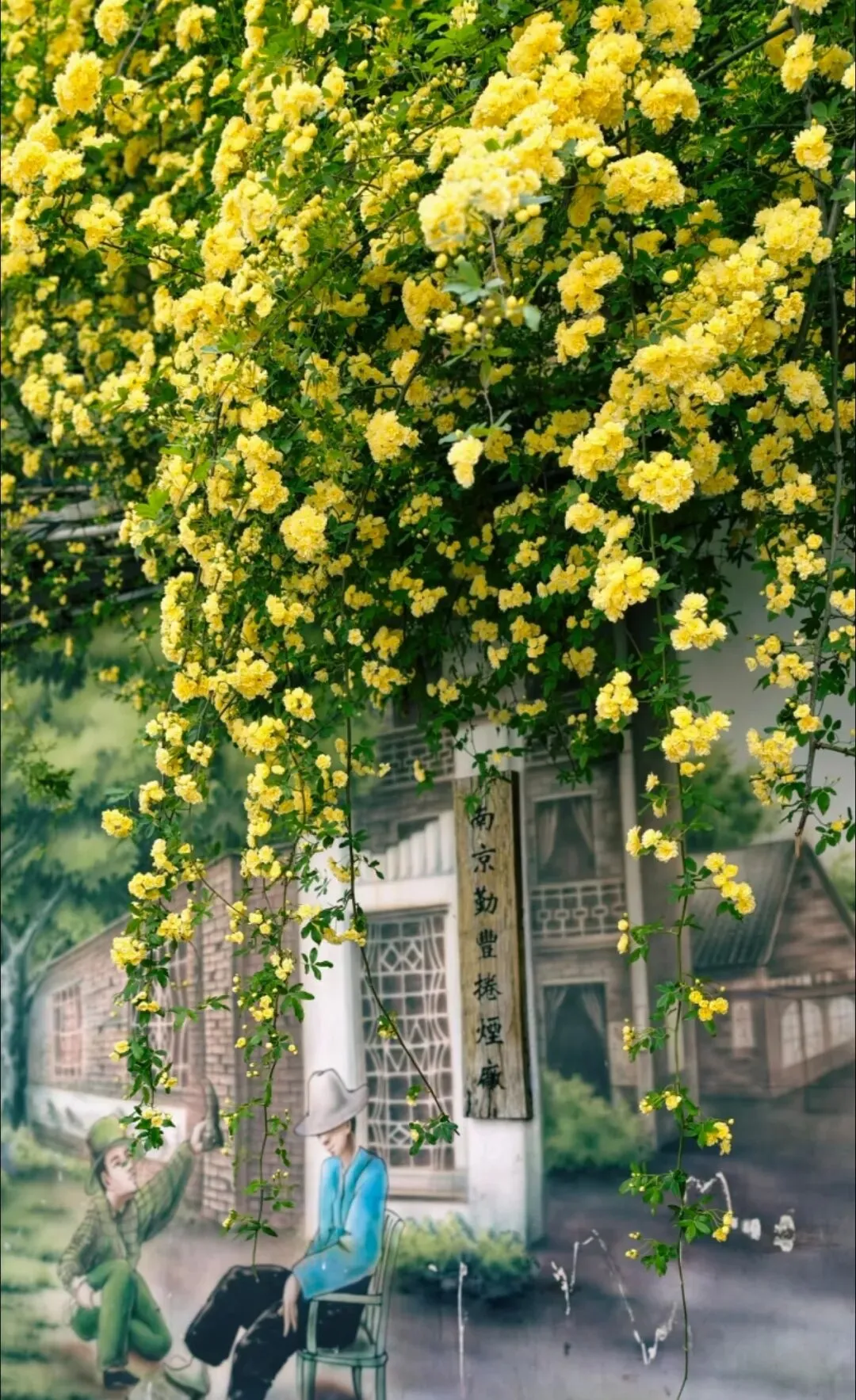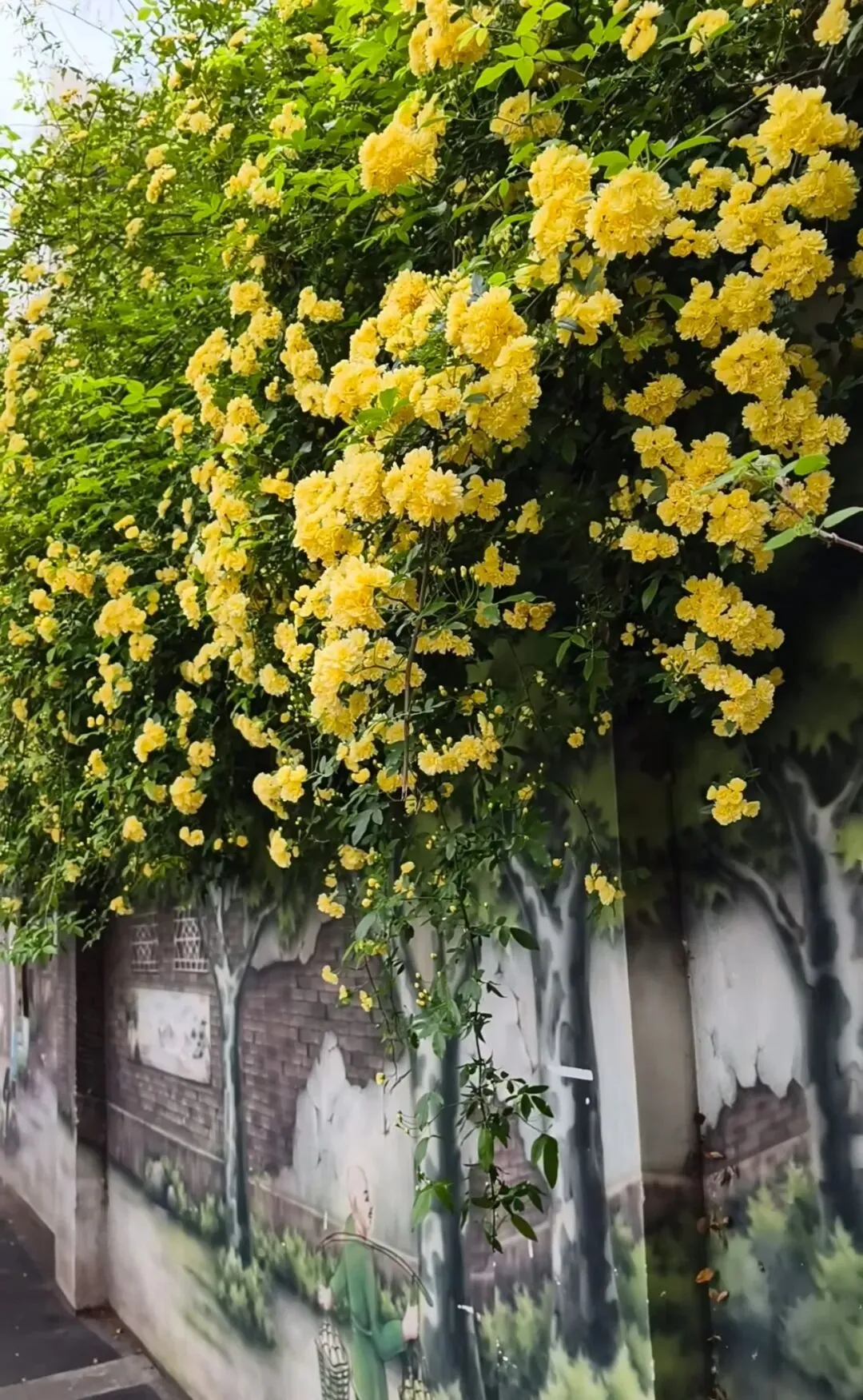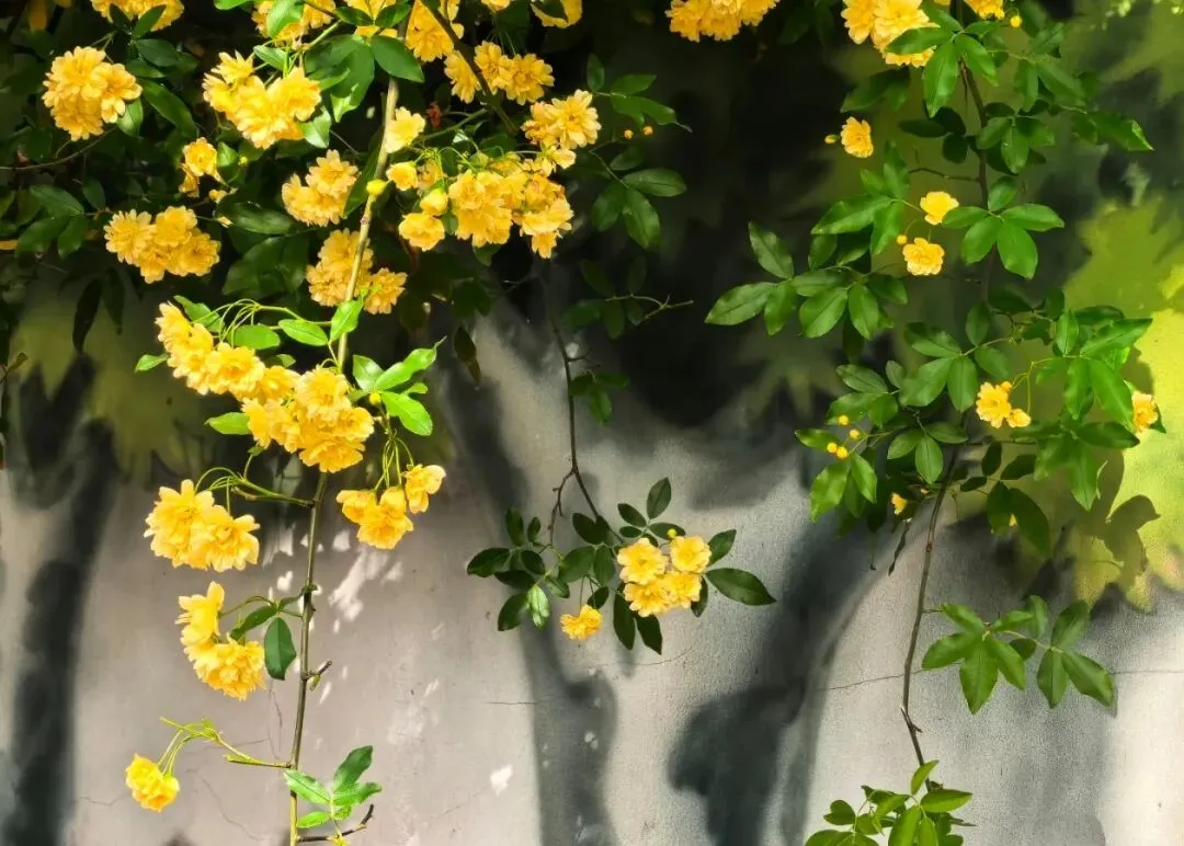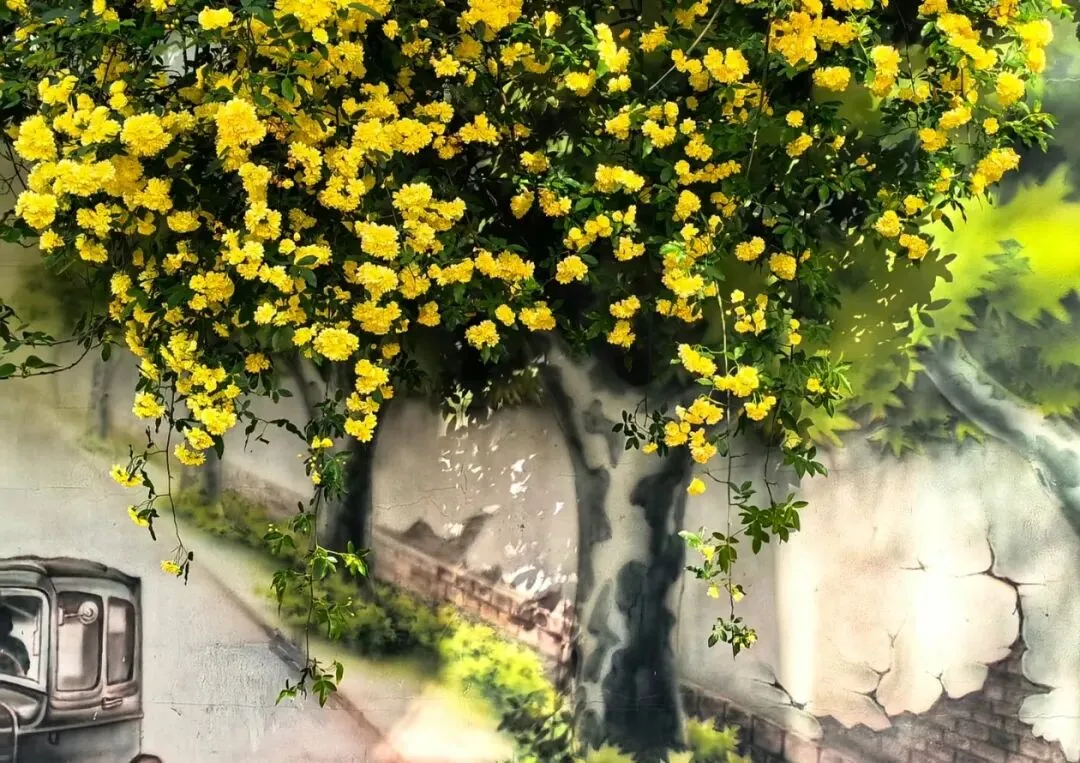 层层叠叠的嫩黄小花,从墙头倾泻而下,柔软的藤蔓带着淡淡的香气,轻轻拂过墙上的旧画。花影与画影交织,仿佛这花本就是从画里生长出来,为静止的岁月,染上了最鲜活的色彩。