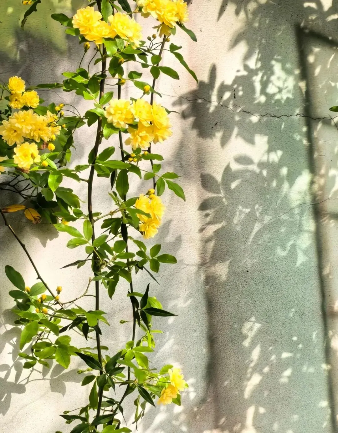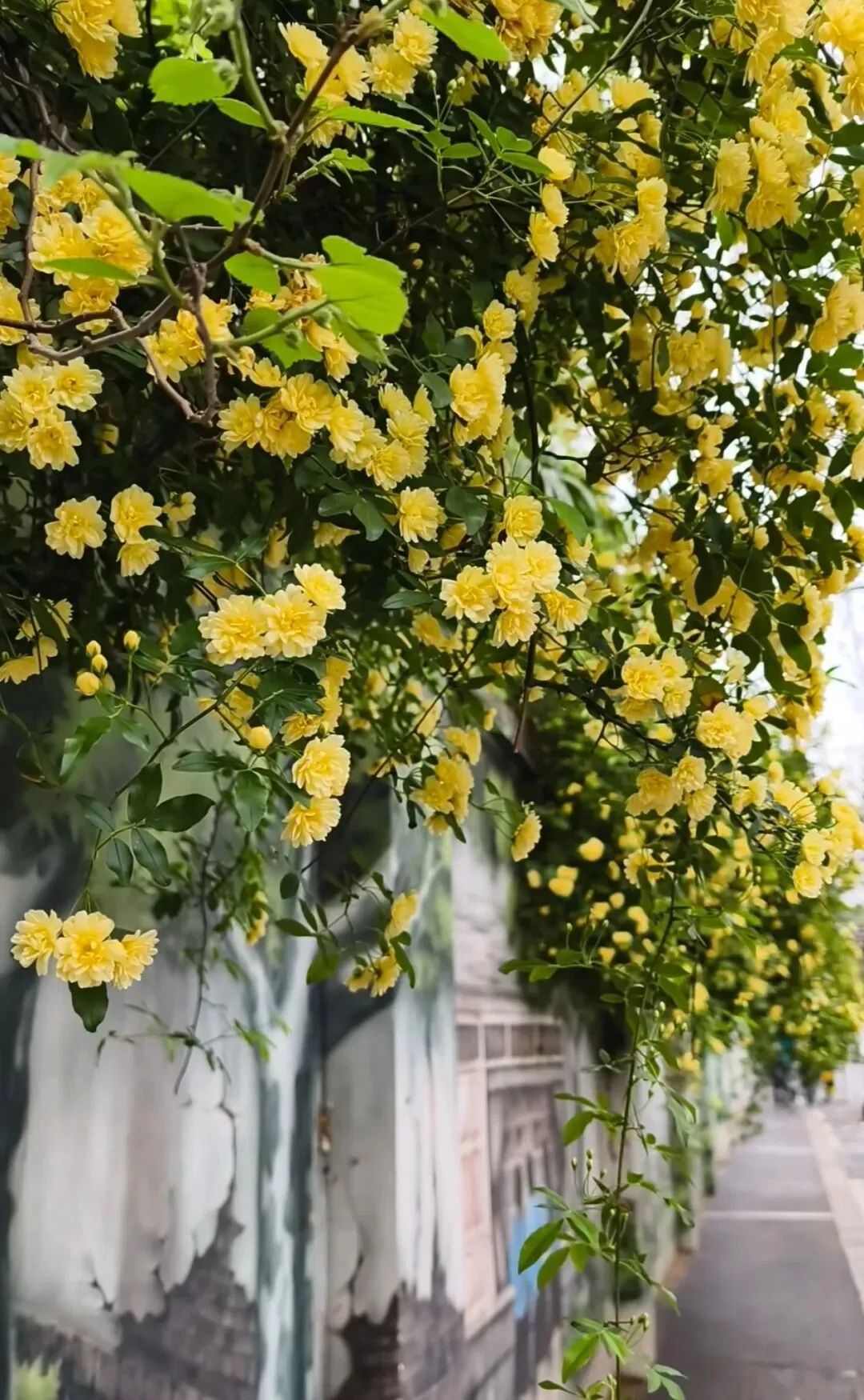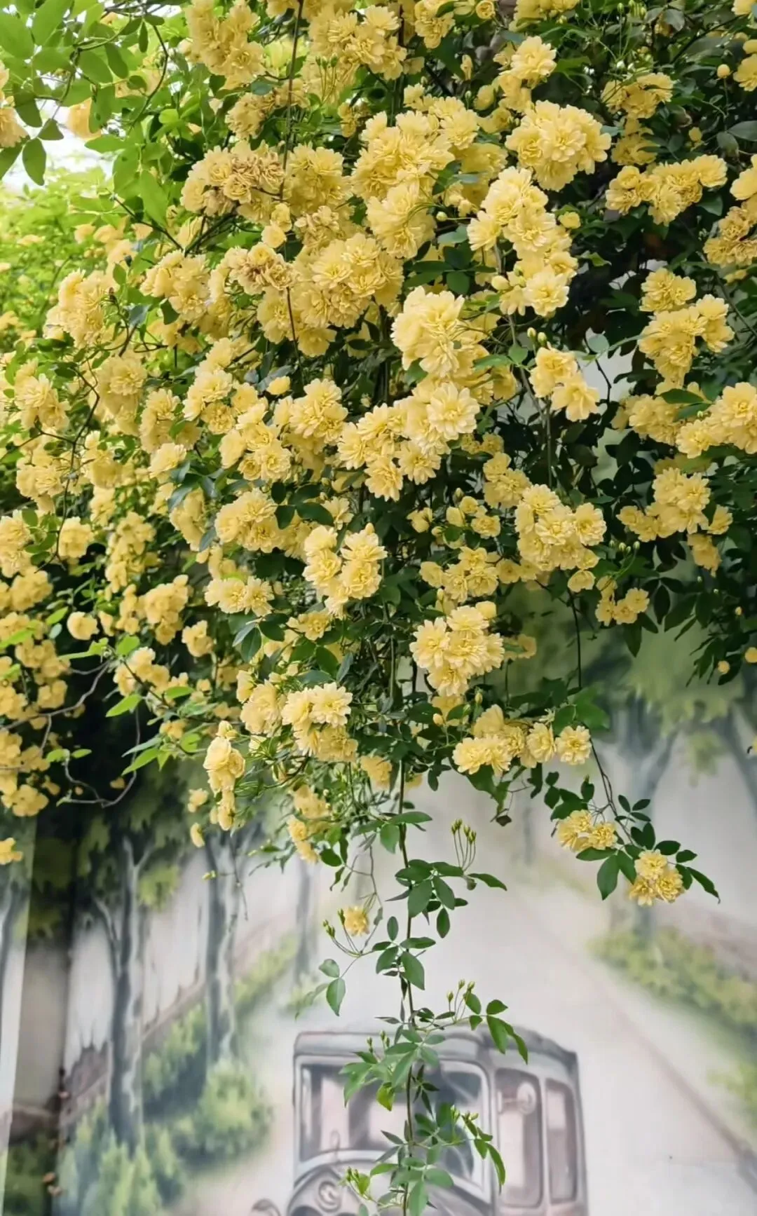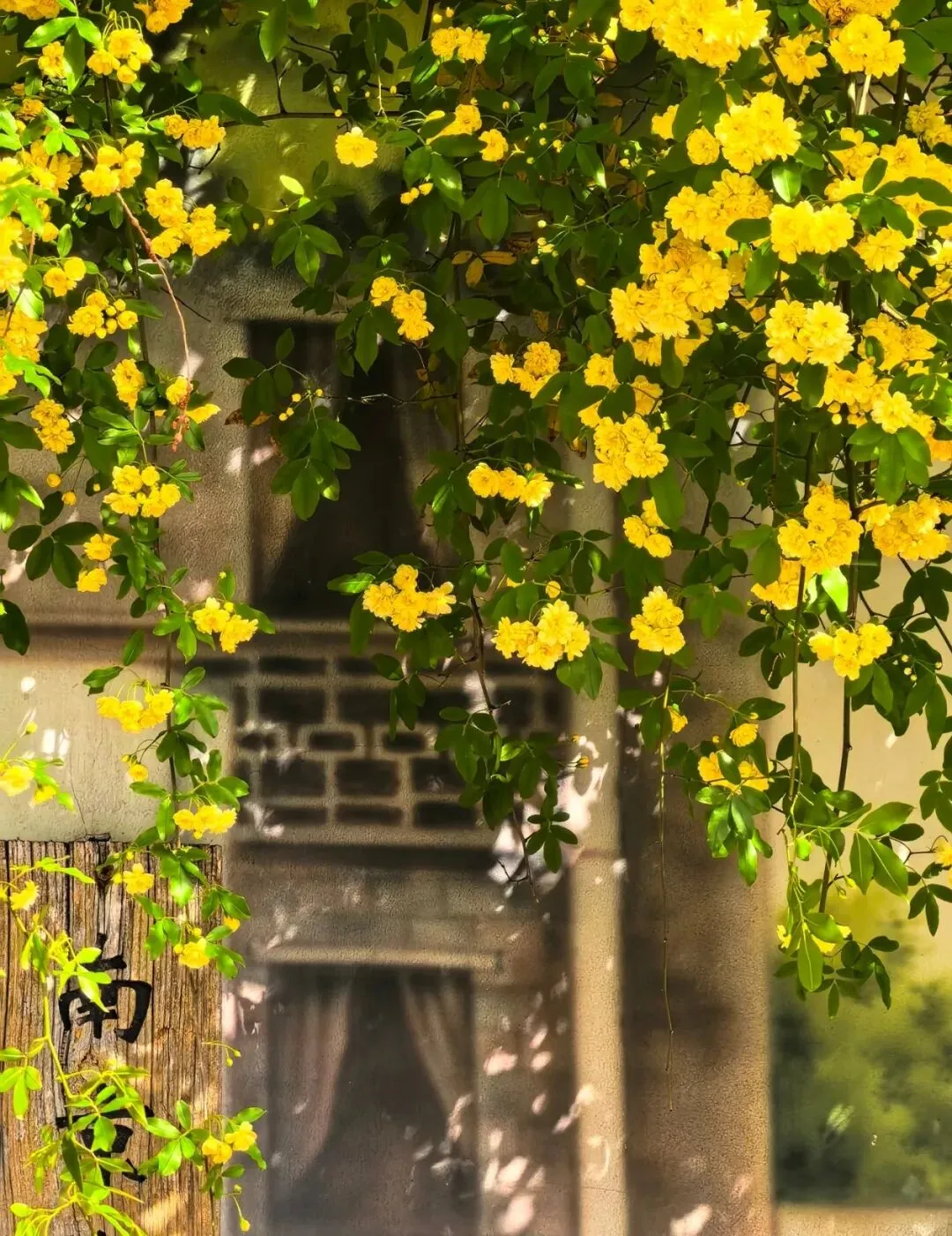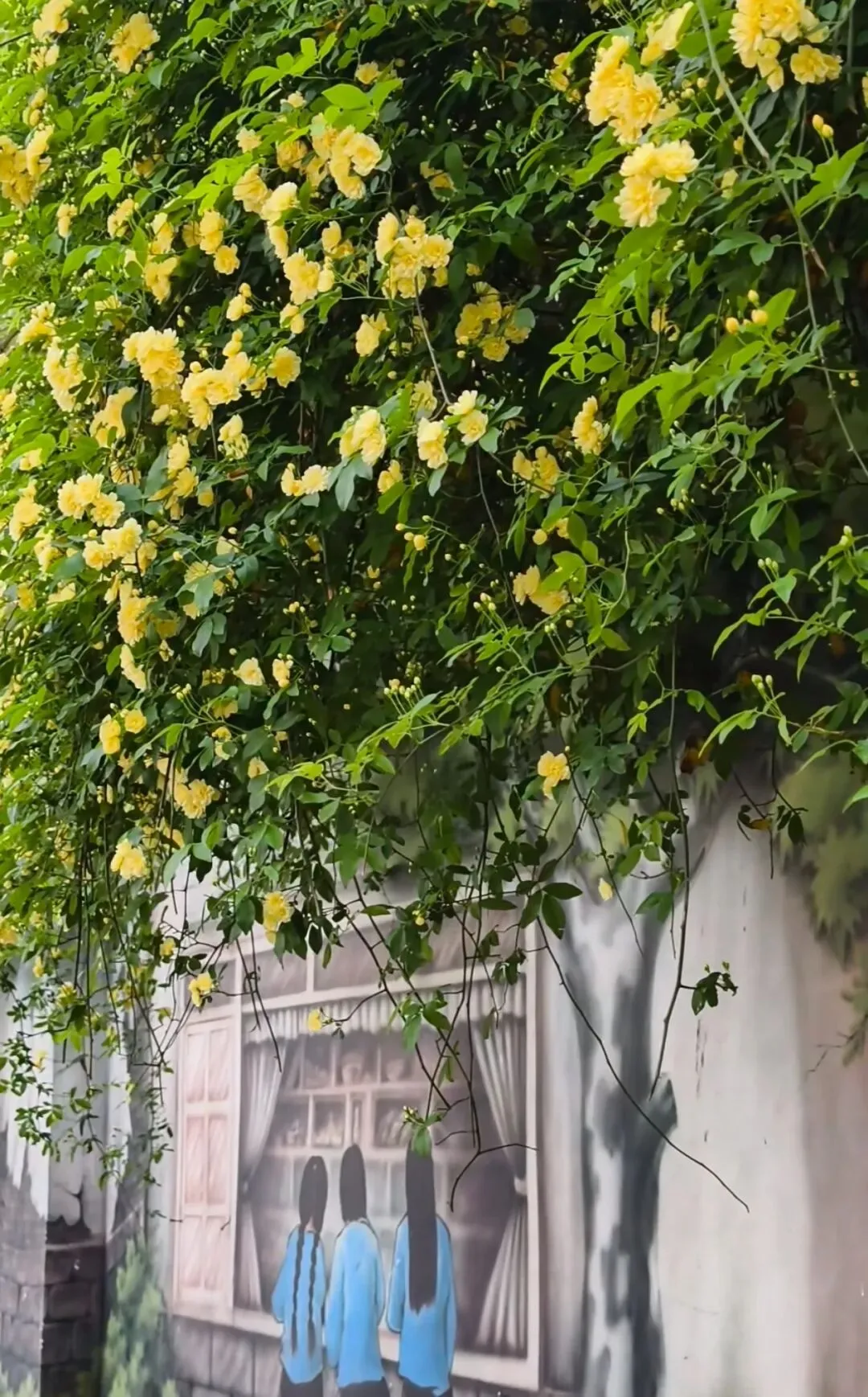 层层叠叠的嫩黄小花,从墙头倾泻而下,柔软的藤蔓带着淡淡的香气,轻轻拂过墙上的旧画。花影与画影交织,仿佛这花本就是从画里生长出来,为静止的岁月,染上了最鲜活的色彩。