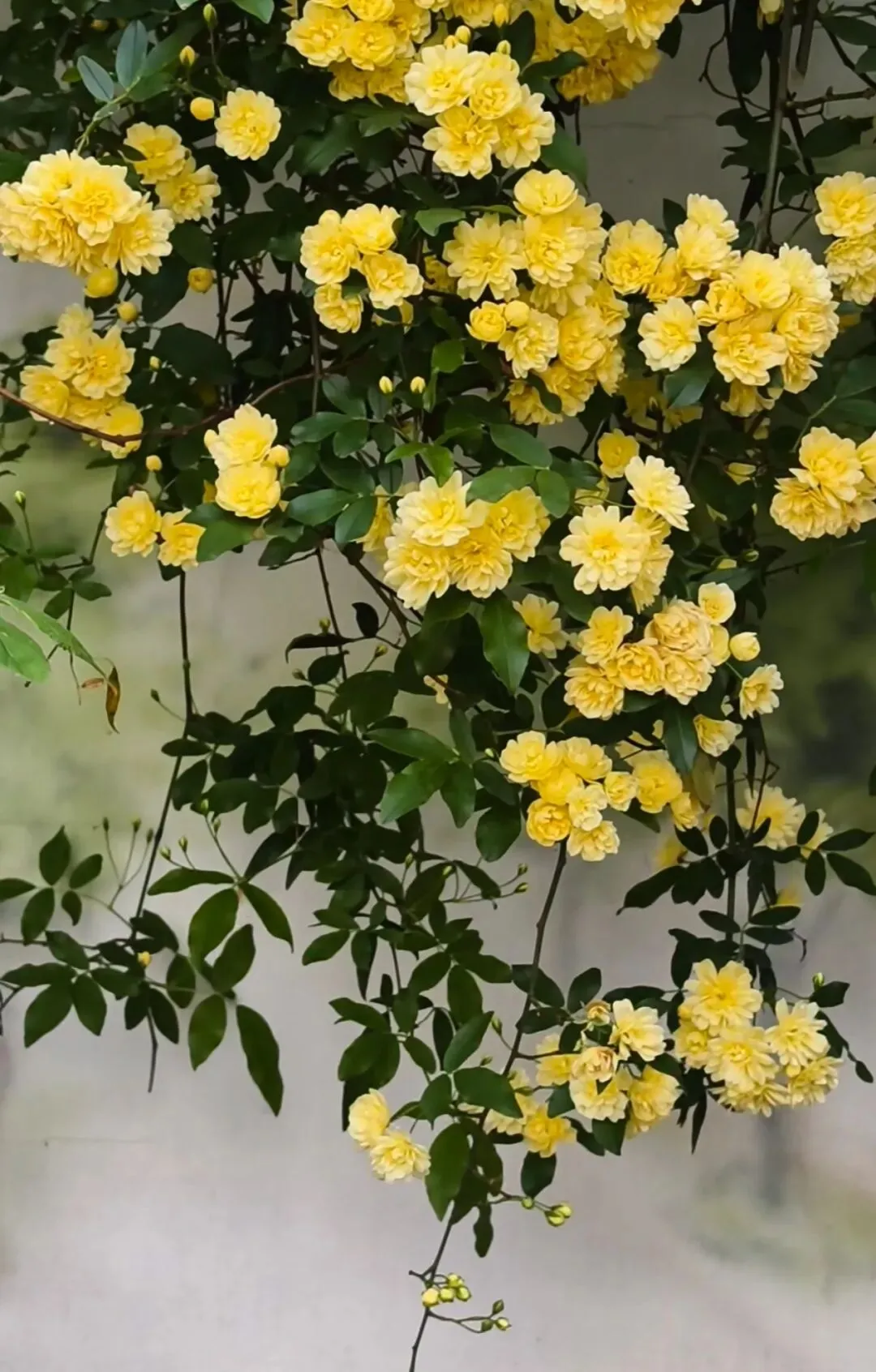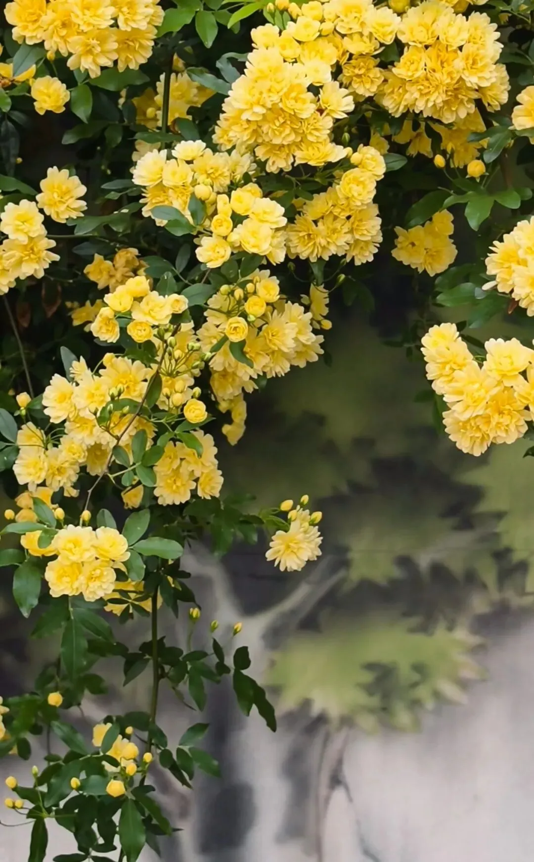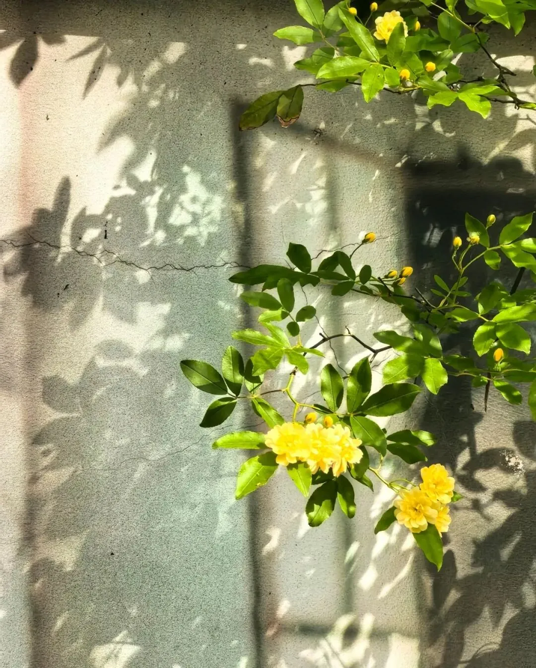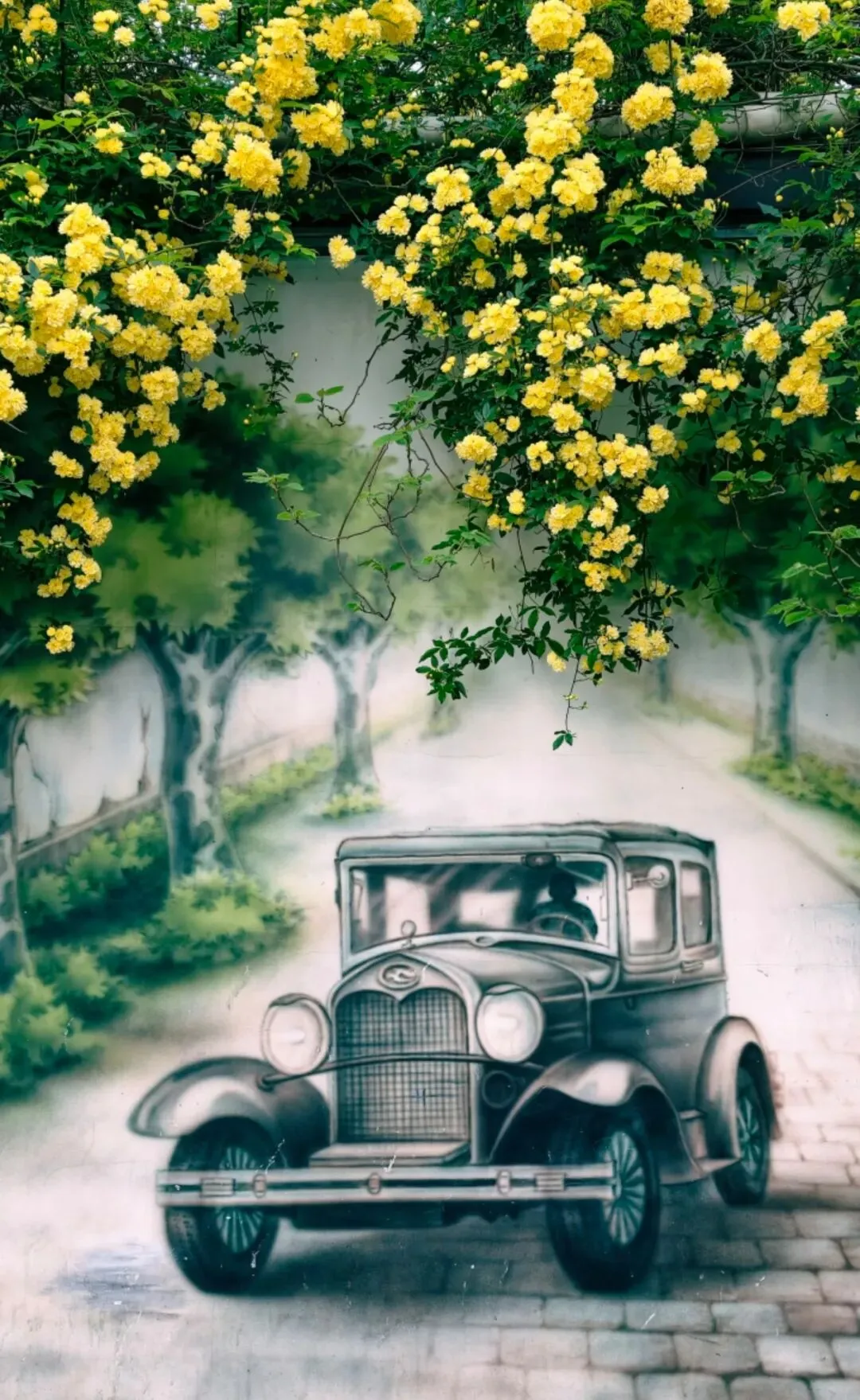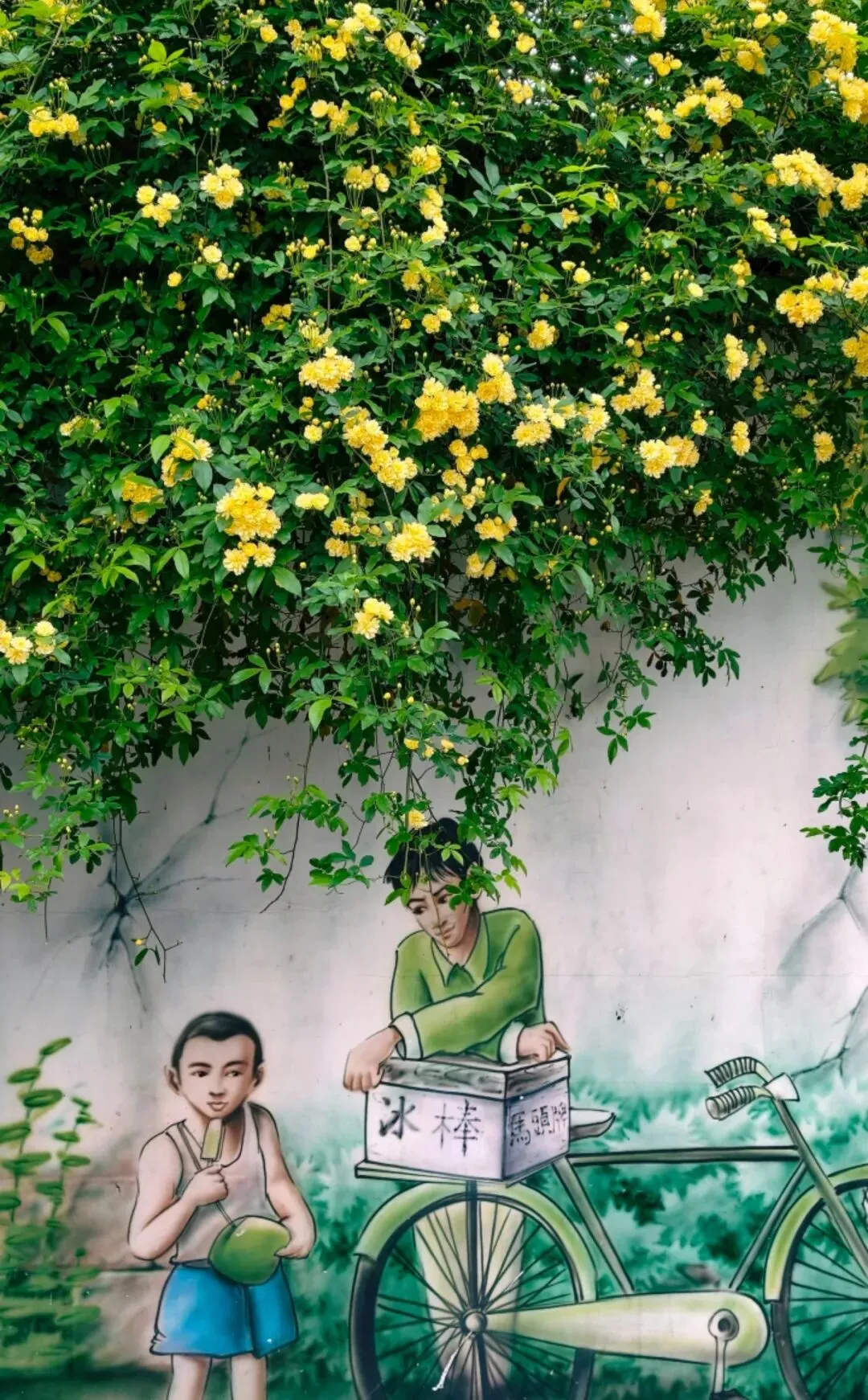 层层叠叠的嫩黄小花,从墙头倾泻而下,柔软的藤蔓带着淡淡的香气,轻轻拂过墙上的旧画。花影与画影交织,仿佛这花本就是从画里生长出来,为静止的岁月,染上了最鲜活的色彩。