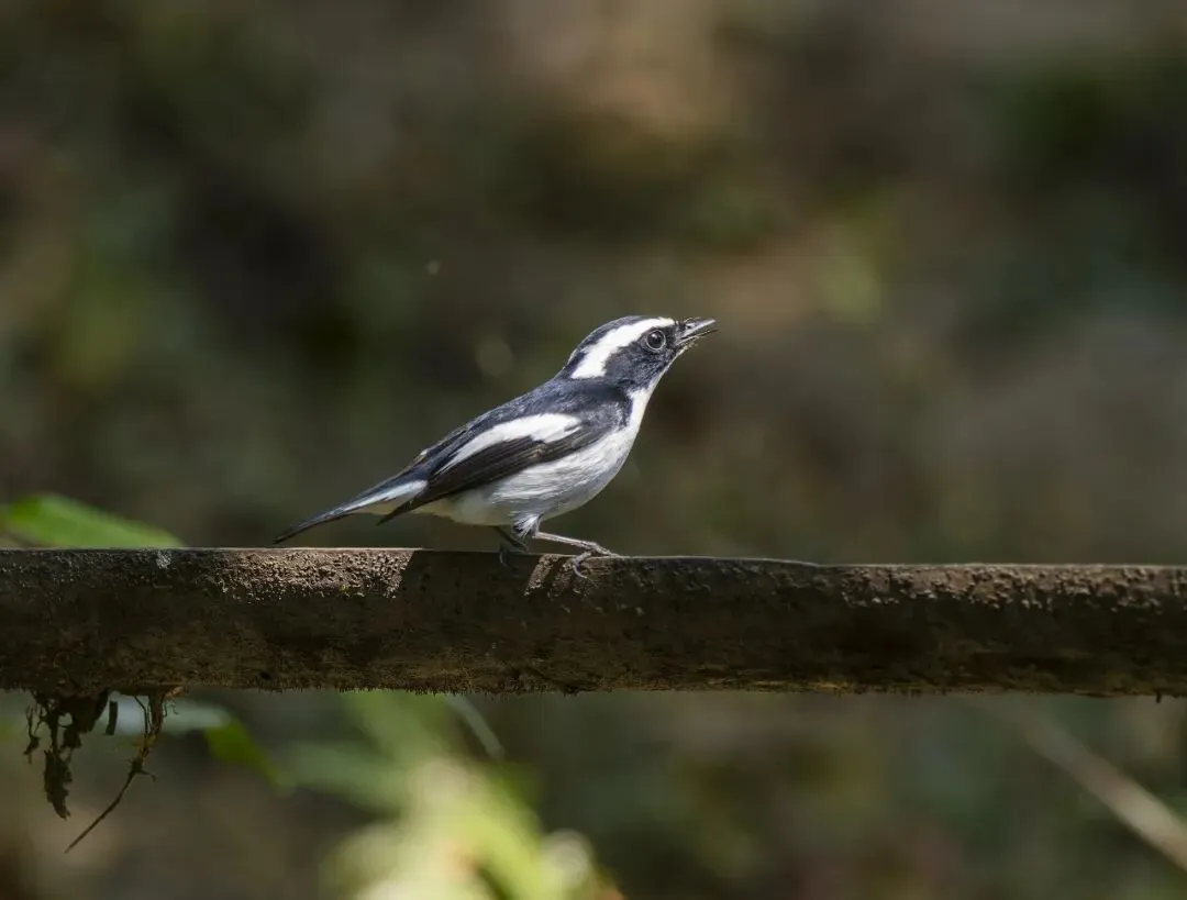 小斑姬鹟雄鸟上体包括两翅和尾黑色具暗蓝色光泽,眉纹白色长而宽阔,自额基向后延伸至后颈。眼先、脸颊、耳羽和头侧黑色,内侧大覆羽和,内侧飞羽外翈白色,在翅上形成大块白斑。尾巴黑色,除中央一对尾羽外,其余尾羽基部白色,下体白色,两胁沾灰色。 [