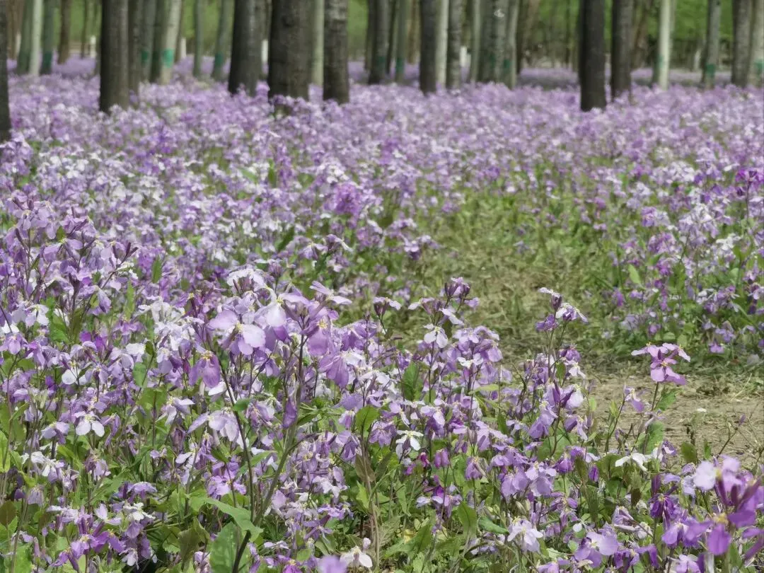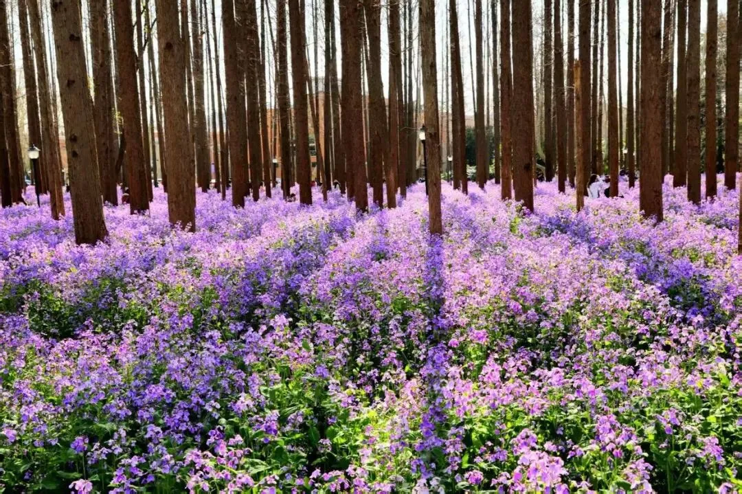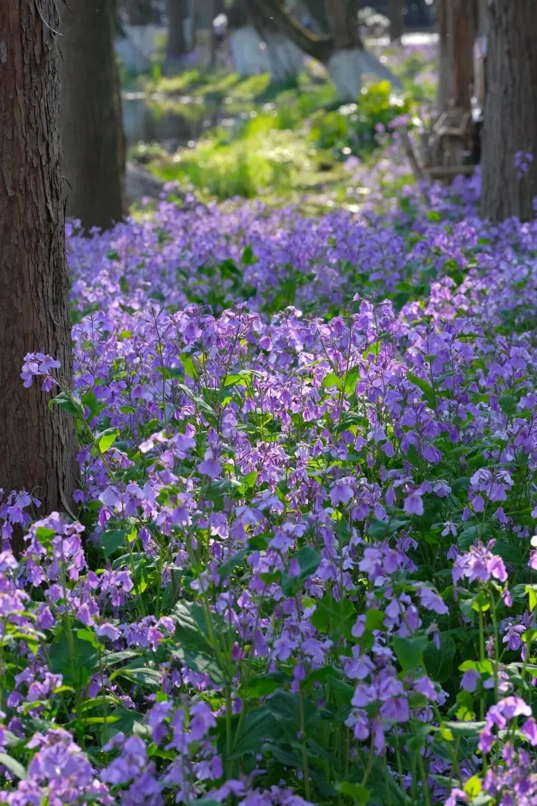 下车不过三分钟,当你第一脚踏上那条木质栈道时,扑面而来的不再是汽车尾气,而是草木复苏的清香。膝盖边上,那一丛丛像紫色薄雾般的二月兰正探着头。这里的花开得厚实,密密麻麻地铺在林子底下,手机随手一举,背景干净得连修图软件里的消除笔都省了。发到朋友圈里,那份透着野趣的静谧,往往能在一众鸡鸣寺的“人头背景墙”中瞬间脱颖而出。