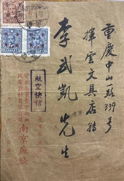 这枚实寄封为民国标准牛皮纸公函封,制式规整,票面信息完整清晰。信封正面标注收件地址为重庆中山一路339号,由挥云文具店转李武凯先生收,寄件方为资源委员会中央无线电器材有限公司南京厂,寄件地址为南京板桥镇。