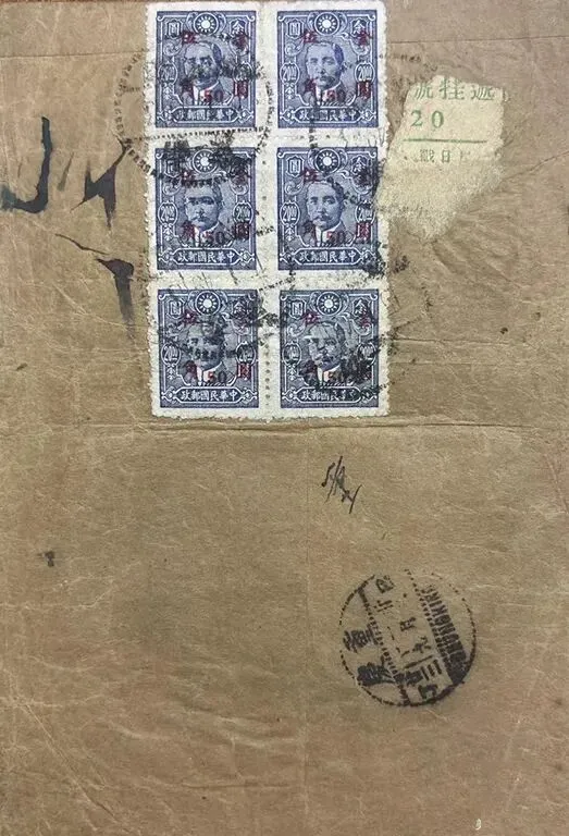 1948年国民政府推行金圆券币制改革,法币大幅贬值,原有法币面值邮票一律加盖金圆改值后流通,1949年1月3日,民国邮政总局上调国内航空邮件邮资,航空挂号快寄20克邮件合计邮资为金圆券6元。