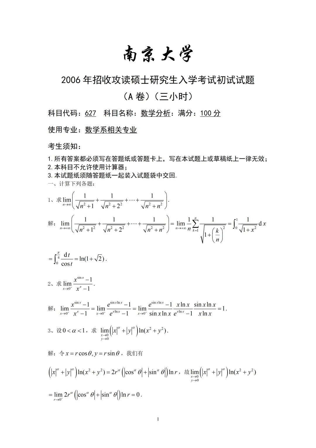 南京大学2006年招收攻读硕士学位研究生入学考试《数学分析》试题及答案,第一题选择题我给出了详细的解答,有助于同学们对每一个概念有一个准确的认识,不但知其然,而且知其所以然,对一致连续性,无穷大量、函数的改变量、级数的收敛与绝对收敛。第二题填空题,给出了为什么填这个值的理由,写出了详细的推导过程,第三题证明题等等,总的来说,我们对每个题目都做了详尽的解答,以便让同学们一看就明白,容易掌握这个知识点,对复习考研是很有好处的,以后我会对北京交通大学的题目逐一给出解答,对这个学校有报考意向的同学,可以下载参考,希望对同学们有所帮助,做真题前,好好复习课本是很有必要的,课本要反复的看,题要反复的做,日积月累,终会有所收获的,数学的学习很辛苦,同学们只要坚持去学,不会多问,一定能够达到目的.
