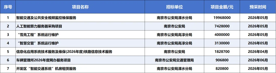 根据 ICT 标局平台数据统计,南京市公安系统计划在 2026 年 4-6 月陆续发布多个数智项目,总预算超 3808 万元。具体详情如下:采购需求概况:南京市公安局人工智能算力服务器采购项目采购需求概况:2026年度高淳区“雪亮工程”系统运行维护。采购需求概况:2026年度高淳区“智慧交管”系统运行维护。项目名称:信息化应用系统技术服务及维保(2026年度)铁路信息技术服务采购需求概况:根据我局需求提供铁路信息技术服务基础资料,由相关技术单位提供2026年度铁路信息技术服务,常态化服务我局警情处置、案件侦破、实战赋能等工作。采购需求概况:为提高网上办理车驾管业务效率,满足群众需要,拟通过采购第三方服务,对涉及车驾管业务的网络平台(12123语音平台、12123互联网后台、交管12123APP等)提供在线办理服务、相关投诉信访处理及其他在线服务等。以上项目详情可在ICT标局平台查询~
