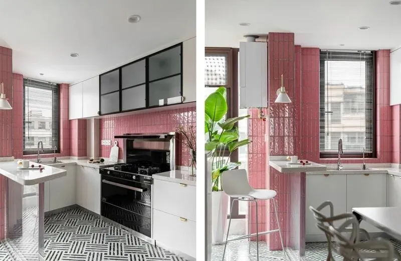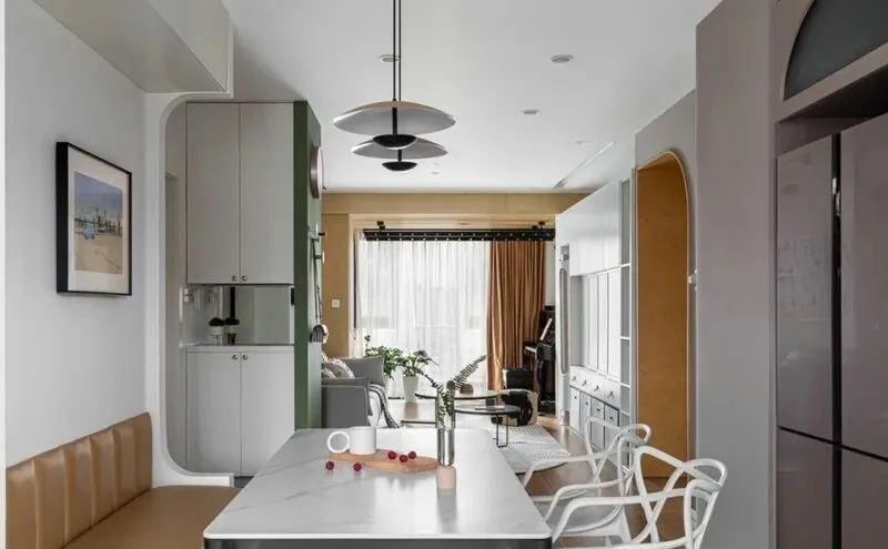 厨房地方看着不大,用了很多小设计,岛台和橱柜是连在一起的操作台,这点我特别喜欢,做饭的时候菜板、水池都在手边,非常方便,厨房地面用灰色地砖,不怕脏,油点掉地上一抹就干净。屋主说,他刚搬进来时,总觉得厨房少了点什么,后来加了隔断推拉门,烟火气就没有串到餐厅,厨房台面还带一排插座,充电锅,咖啡机直接上,平时烧水煮面都很顺手,厨房墙面不是传统瓷砖,是那种微水泥,摸起来很舒服,视觉也统一。
