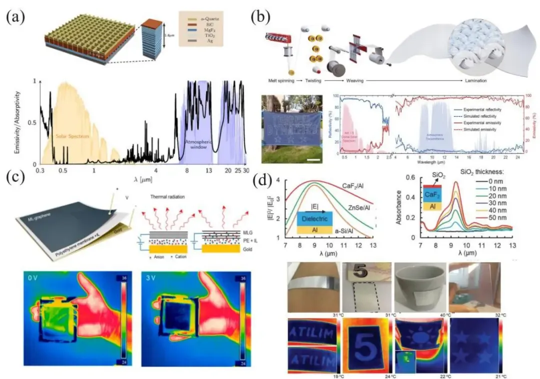 图1 热辐射超表面在热管理领域的应用。(a)辐射制冷器结构示意图以及正入射下的计算辐射率;(b)辐射制冷织物的加工过程及其辐射谱;(c)基于多层石墨烯的超表面设计、主动热表面的工作原理图以及在不同电压偏置下的热伪装效果图;(d)基于纳米厚度介质的结构图和吸收谱以及热辐射图案实现的光学安全加密效果图。