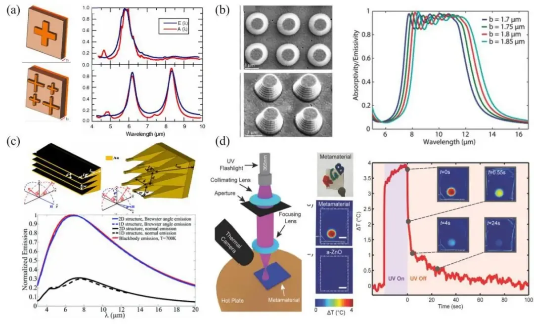 图2 基于超表面的光谱热辐射调控。(a)“金属-介质-金属”三明治构型的超表面示意图及其吸收和辐射光谱;(b)不同尺寸下锥形超表面的辐射率(吸收率);(c)T=700K时一维和二维等离子体光栅结构的辐射光谱;(d)通过紫外光照射实现热辐射光谱的动态调控示意图。